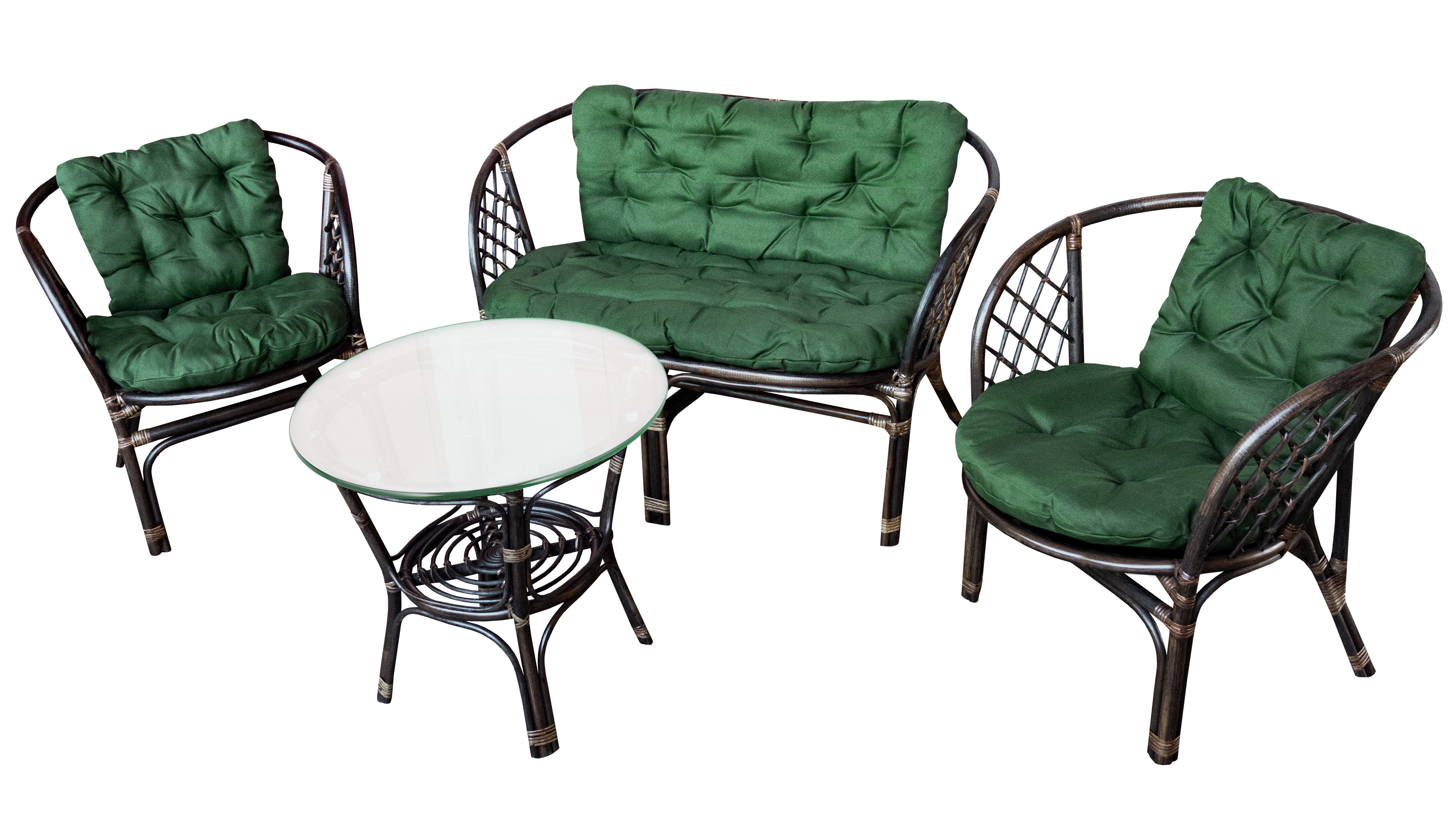 Kolekcia obsahuje dve ratanové kreslá, ratanovú lavicu a ratanový stôl so sklenenou doskou.Stôl má v spodnej časti priestor na odkladanie drobných predmetov.