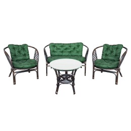 - Sada obsahuje: ratanovú lavicu, 2x kreslá, stôl so sklom a kompletnú sadu vankúšov