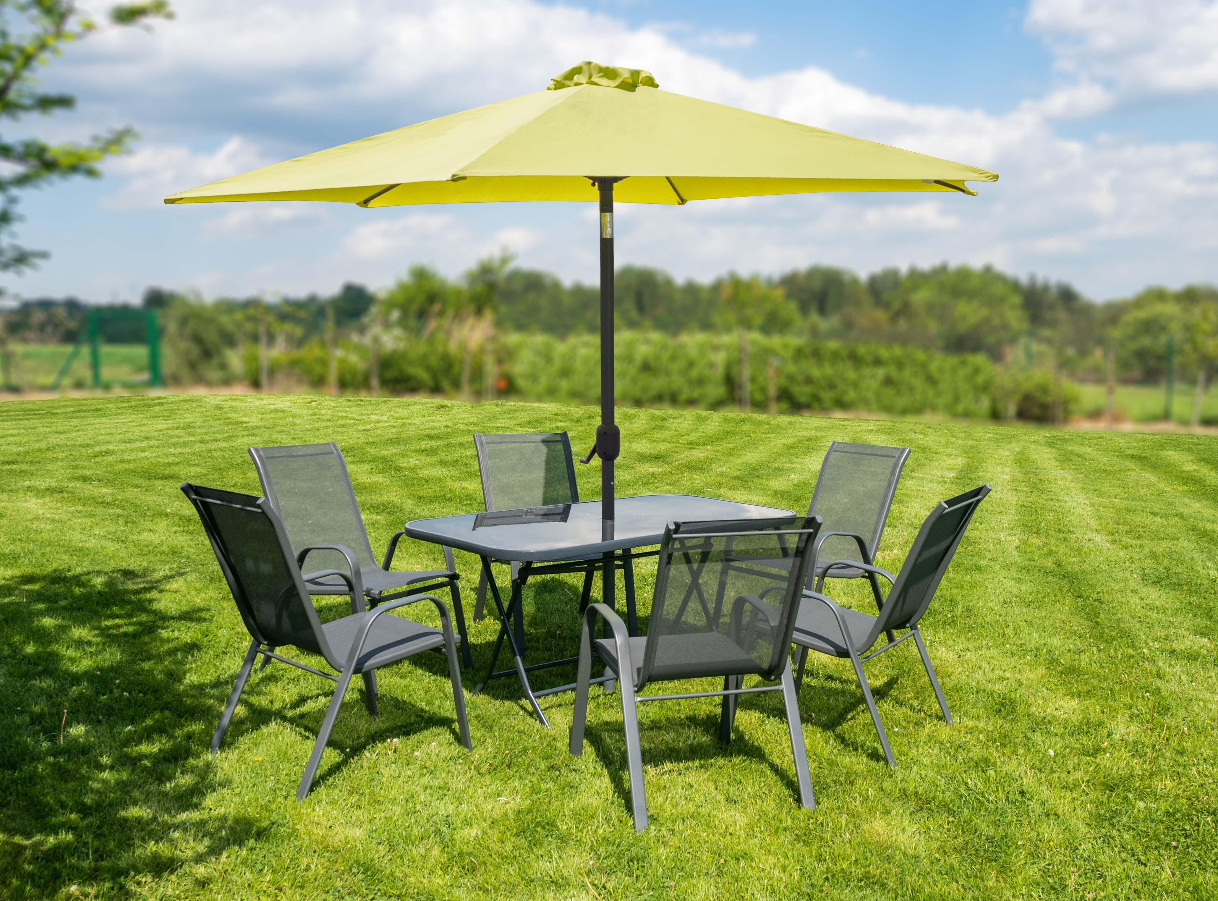 Klasický záhradný slnečník s pevnou konštrukciou a kvalitným poťahom z odolného polyesterového materiálu.
