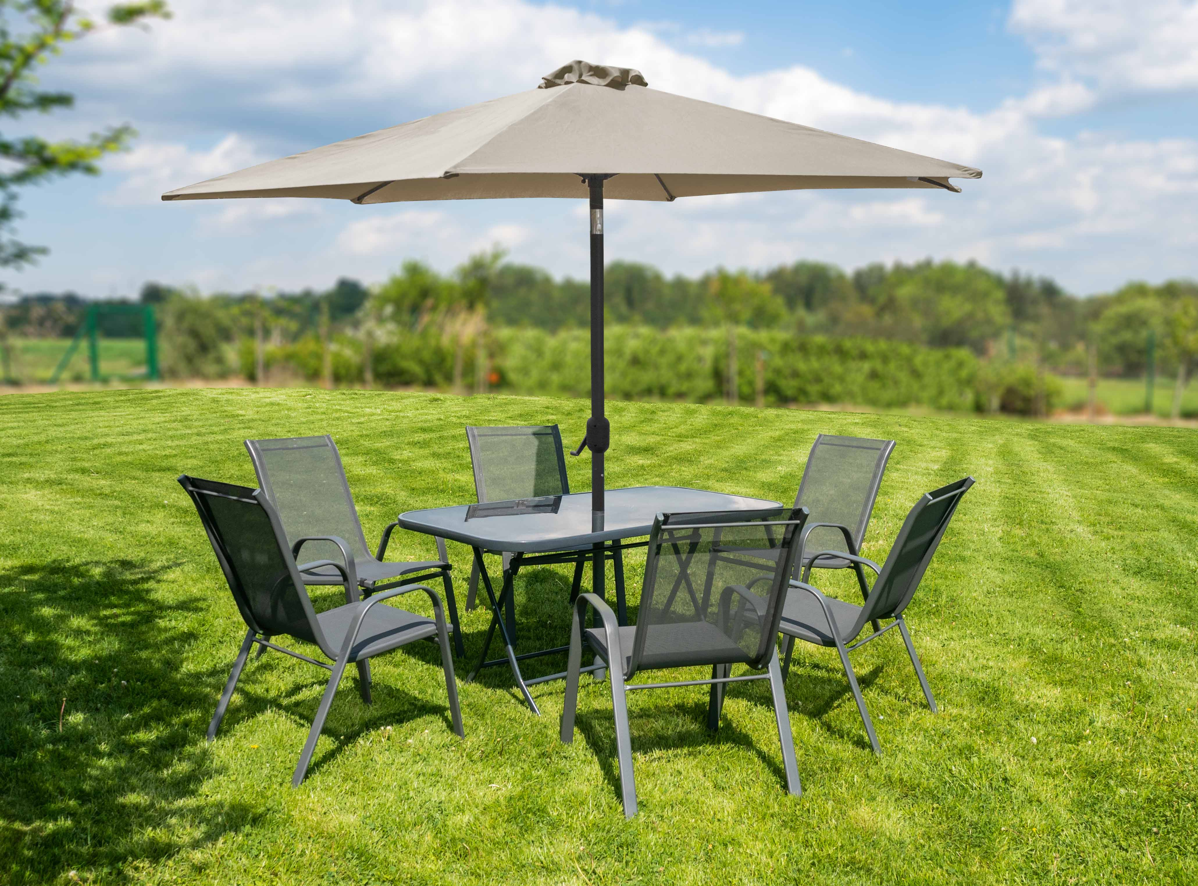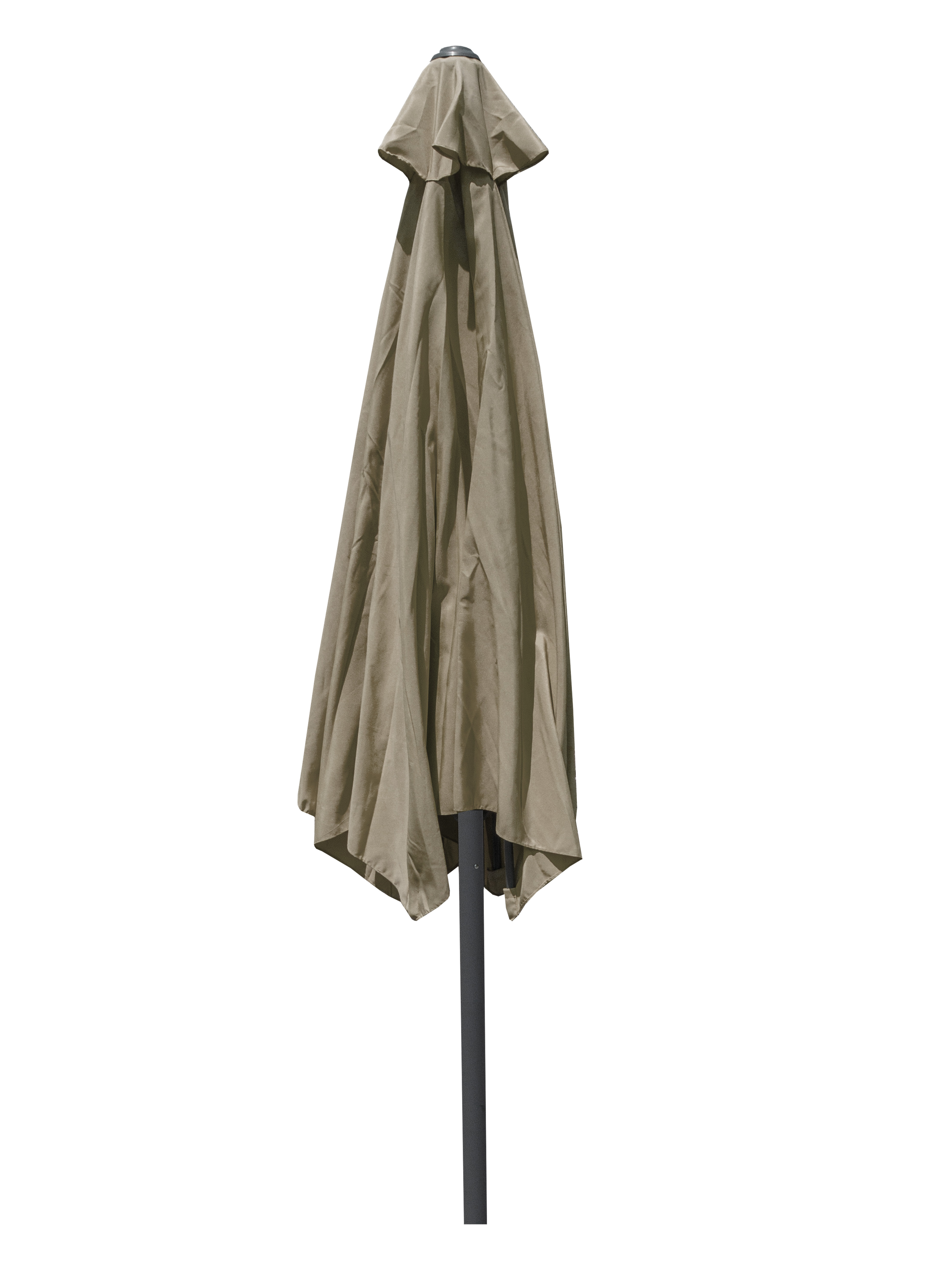 Klasický záhradný slnečník s pevnou konštrukciou a kvalitným poťahom z odolného polyesterového materiálu.