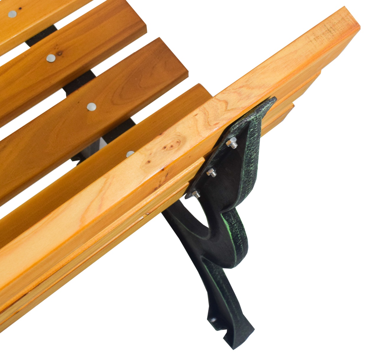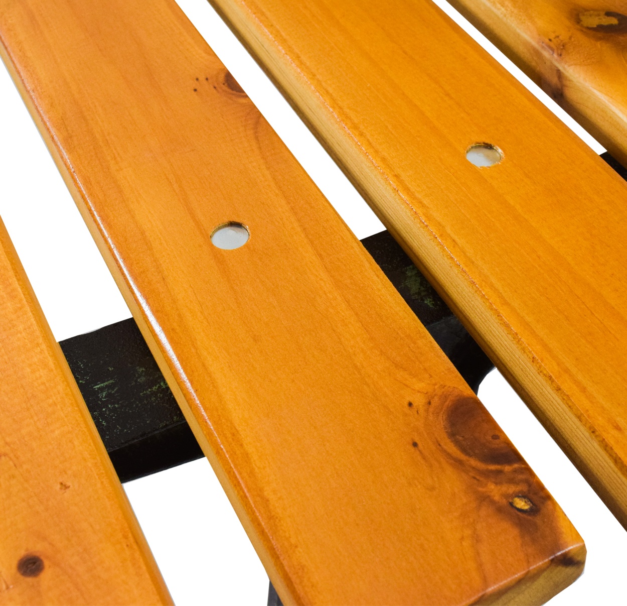 Pevná liatinová konštrukcia doplnená drevenými lamelami. Nosnosť lavičky 240 kg.