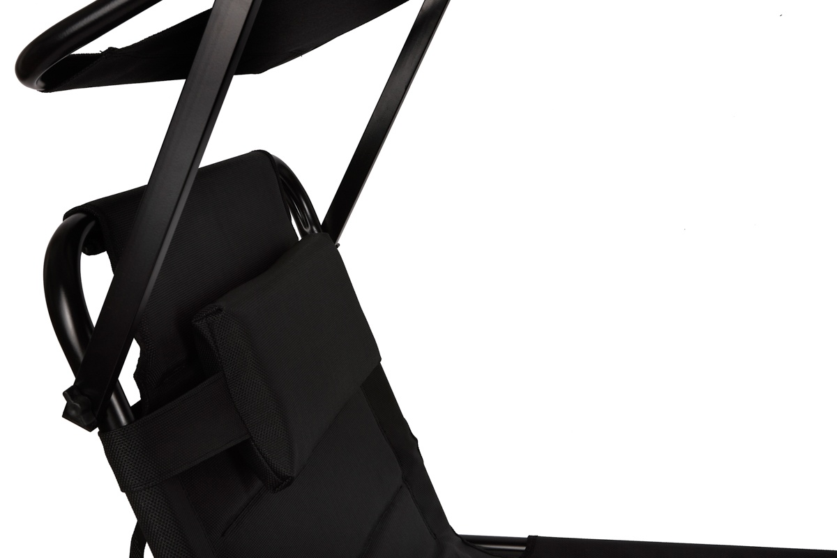Na lehátku možno odpočívať aj pri ostrom slniečku, pretože zabudovaná strieška Váš tvár dokonale ochráni pred prudkým slnkom.