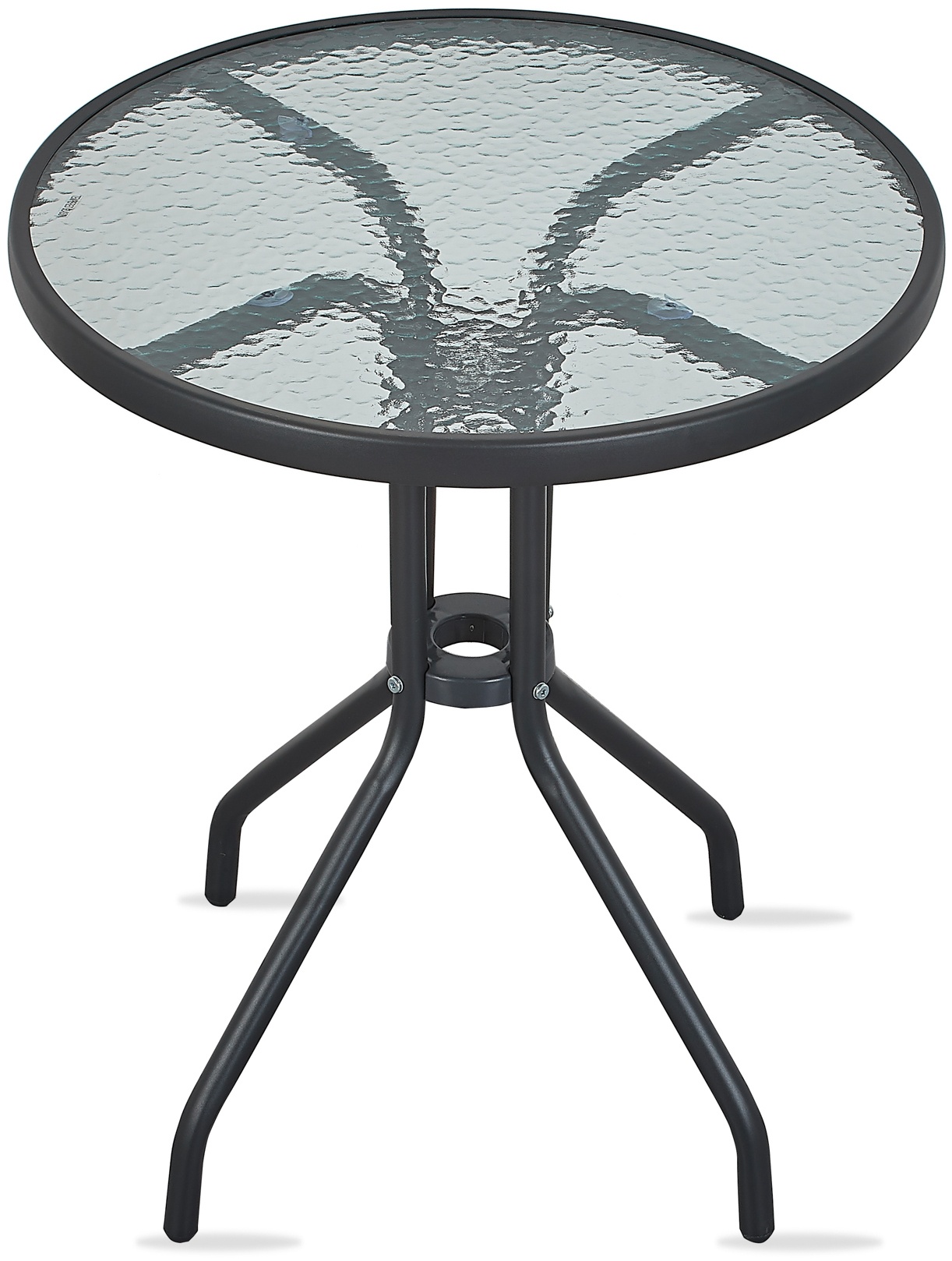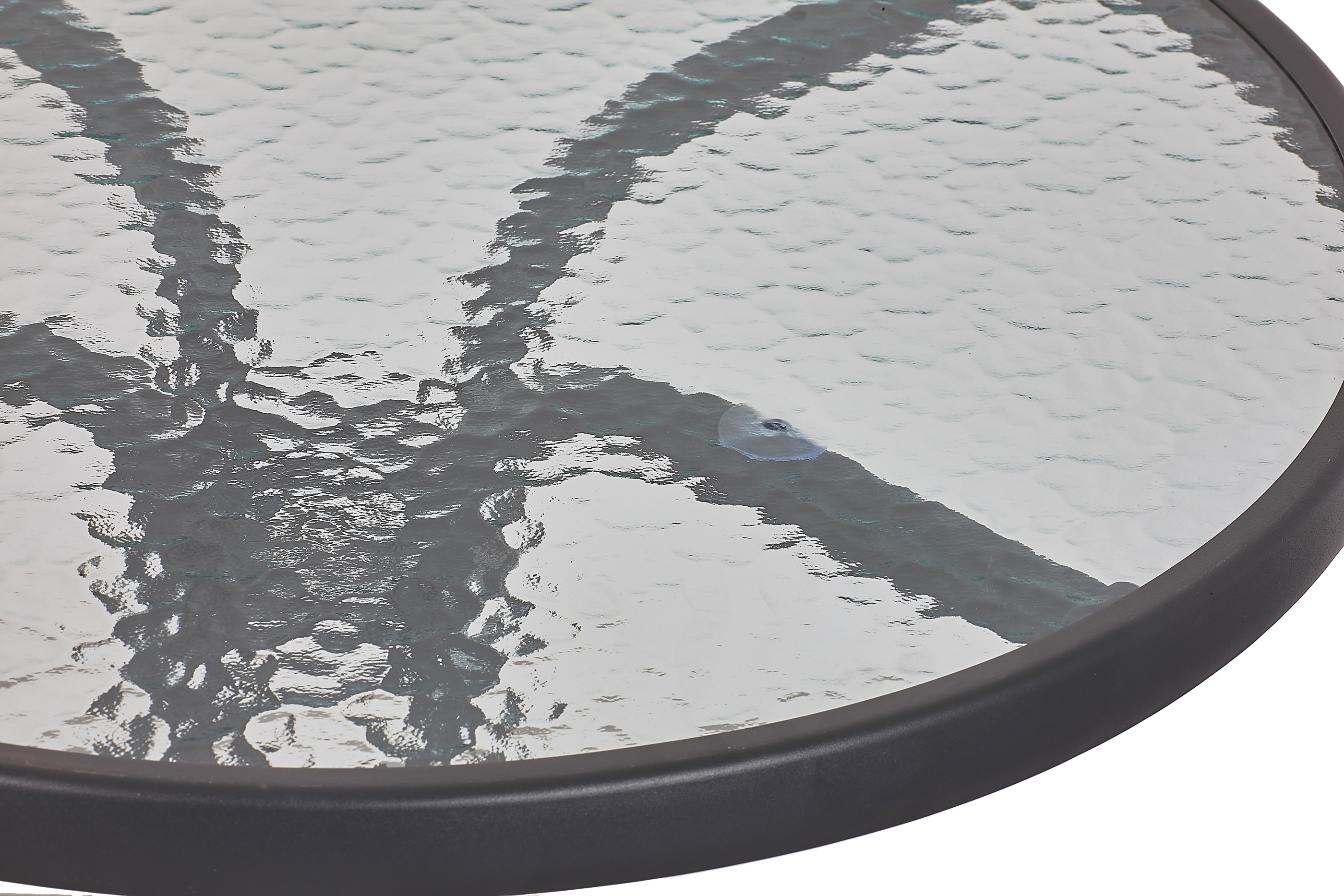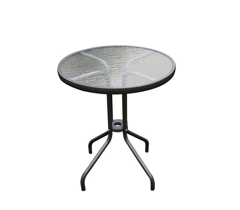 Záhradný stôl s pevným kovovým rámom a vrúbkovanou sklenenou doskou v modernom dizajne, vhodný do záhrad, terasy, kaviarne, altánky, balkóny alebo pláže.