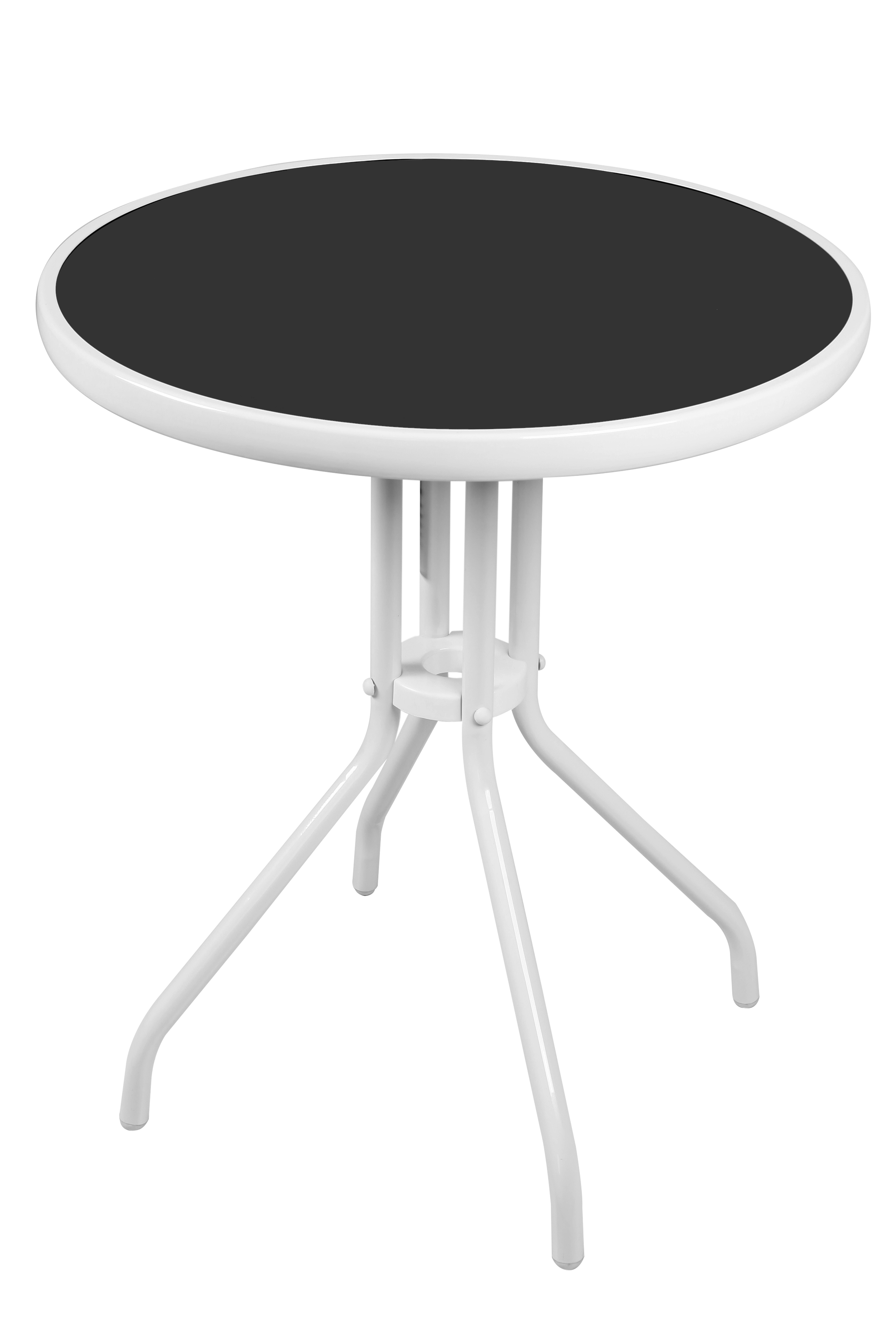 Záhradný stôl s pevným kovovým rámom a sklenenou doskou v modernom dizajne, vhodný do záhrad, terasy, kaviarne, altánky, balkóny alebo pláže.