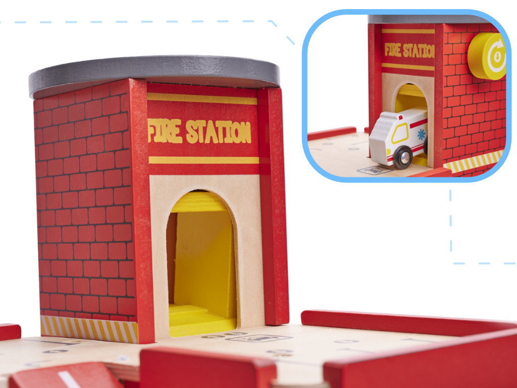 Táto jedinečná garáž má štyri úrovne! Prvé tri sa používajú na parkovanie hasičských vozidiel. Je tu miesto pre vozidlá, ktoré sú súčasťou sady, ale svoje miesto tu nájdu aj ďalšie obľúbené autíčka vášho dieťaťa.