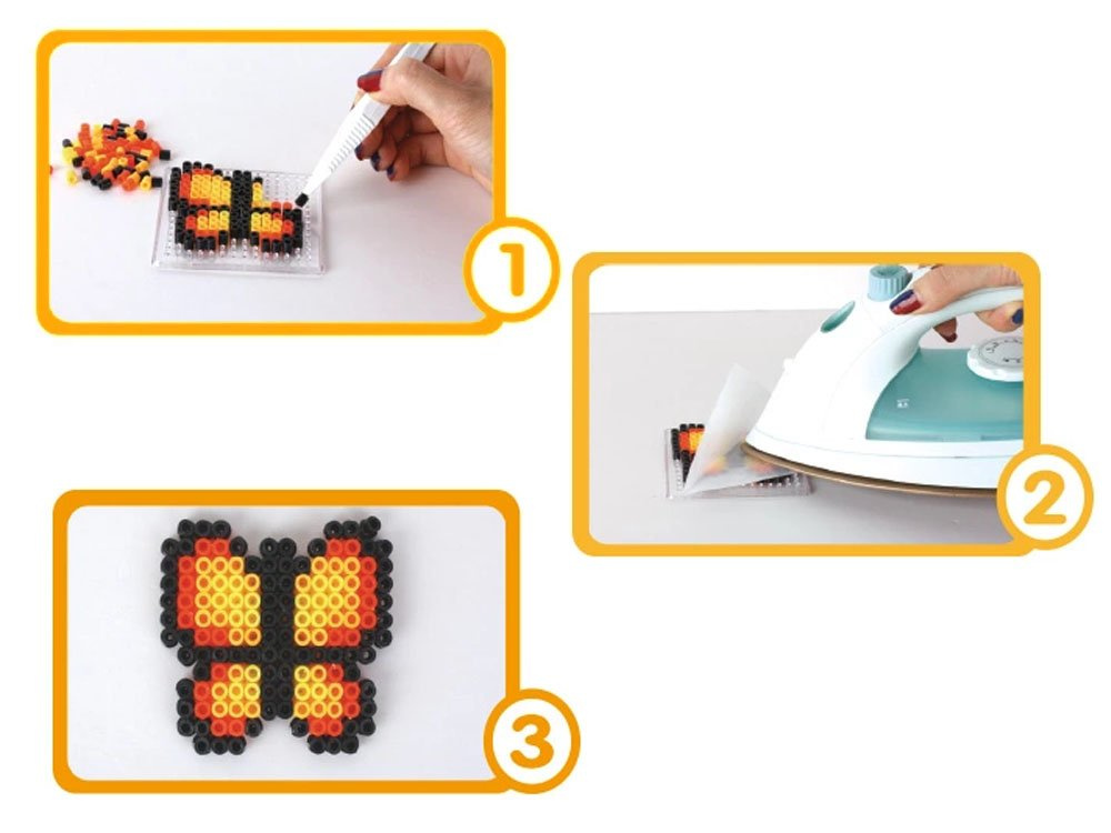 Umiestnite vybraný vzor na podložku a potom zažehlite korálky na priloženom papieri (žehlička by mala byť nastavená na strednú teplotu). Vymáčknutú mozaiku umiestnite na niekoľko minút pod ťažký predmet a je hotovo!