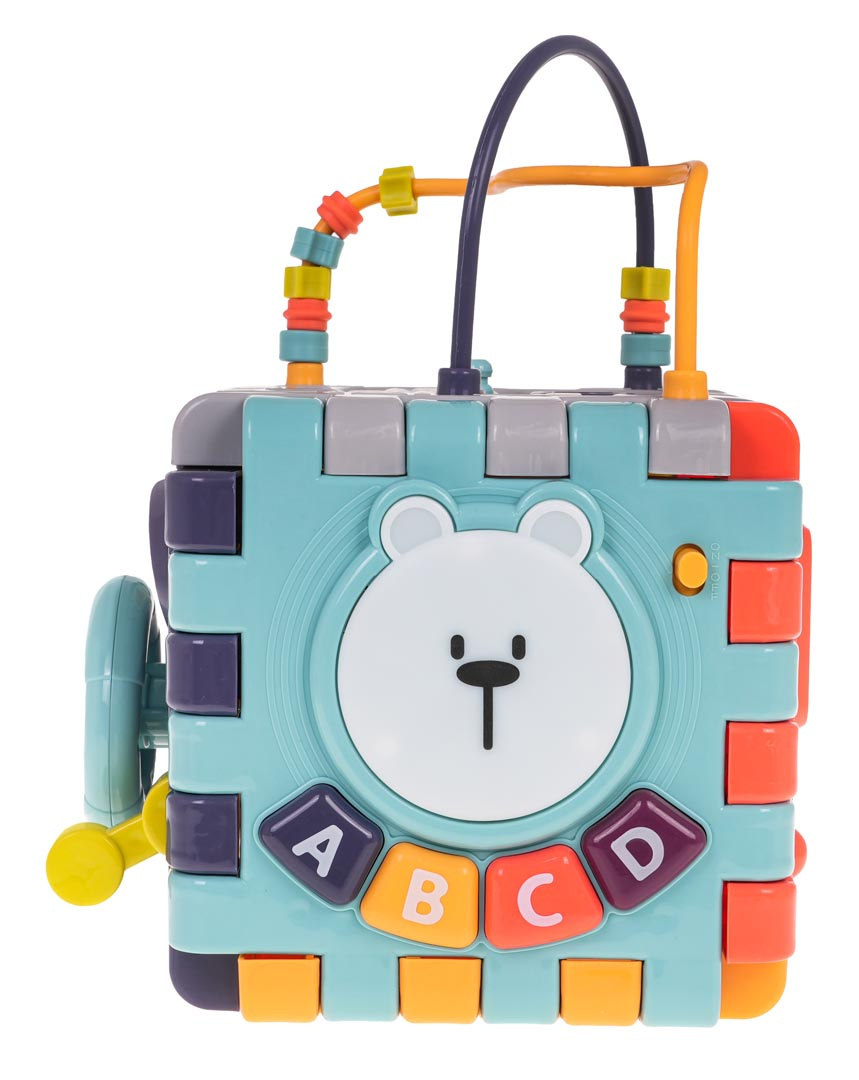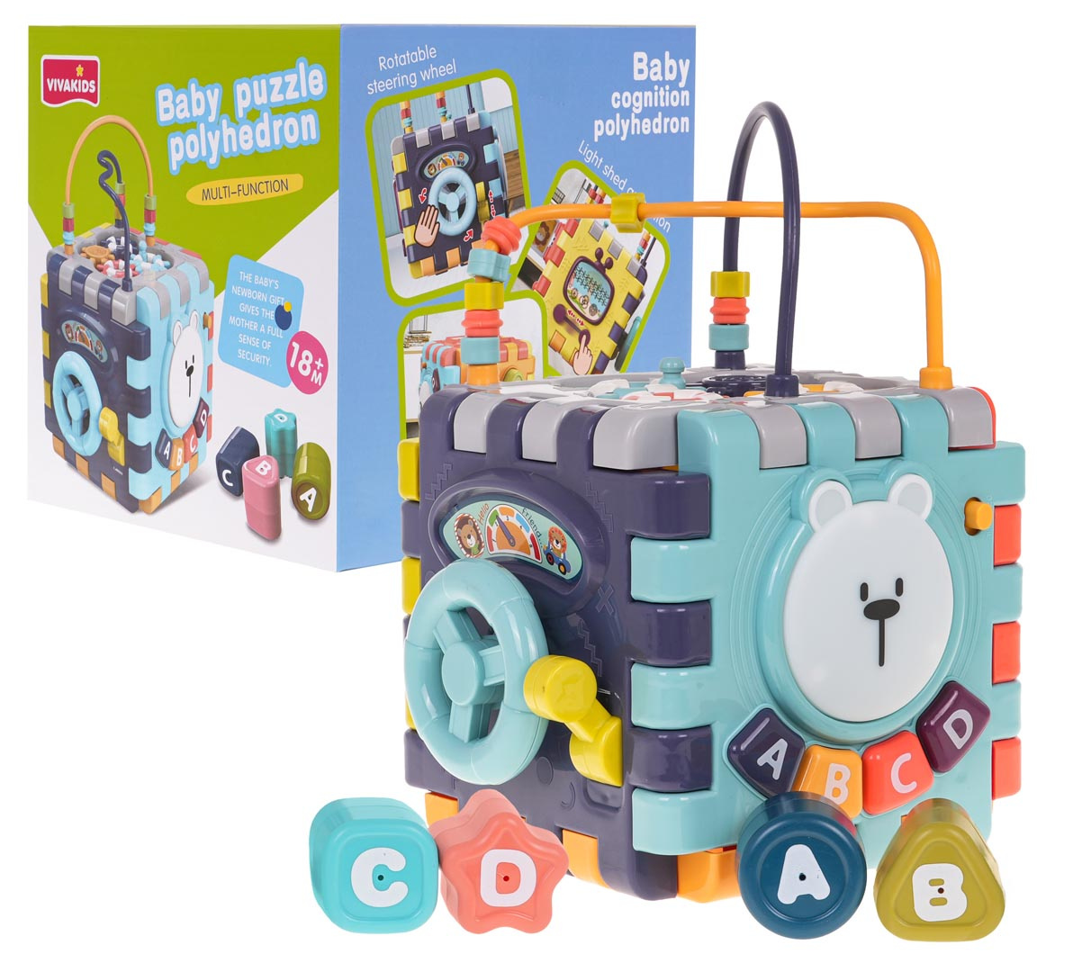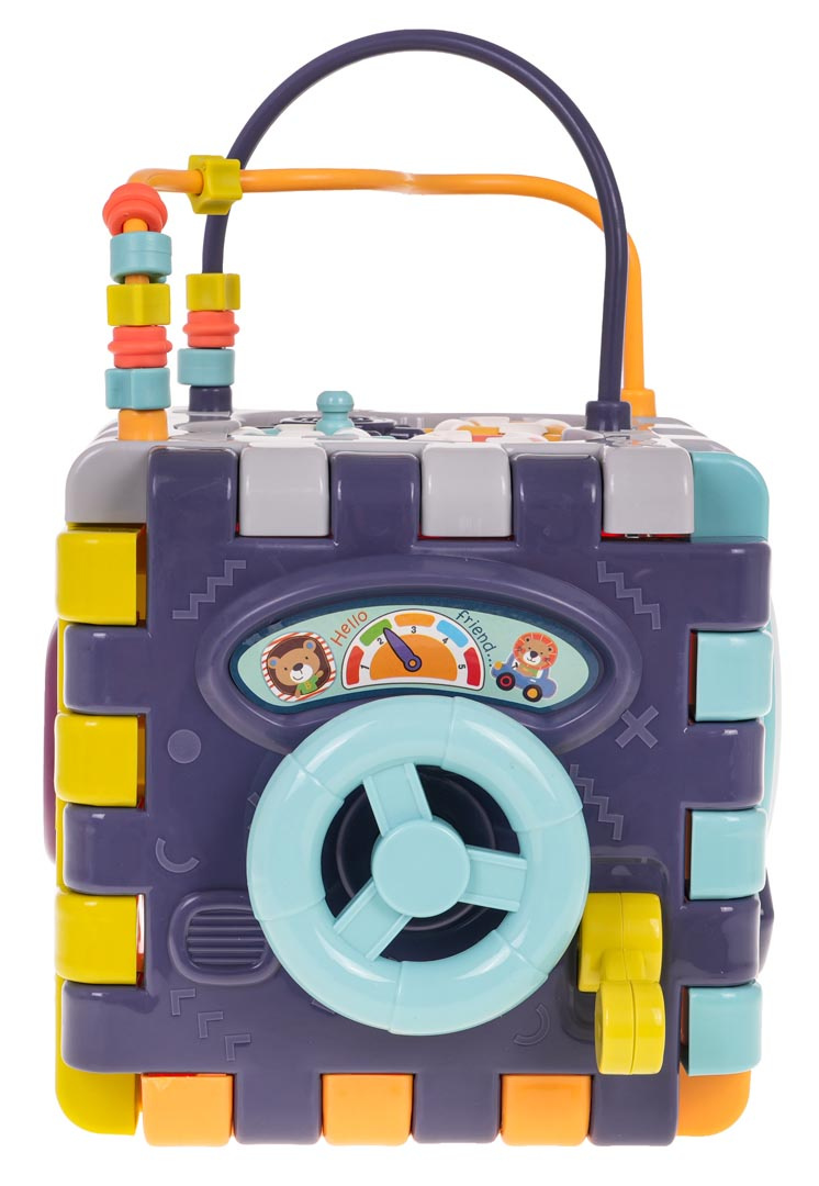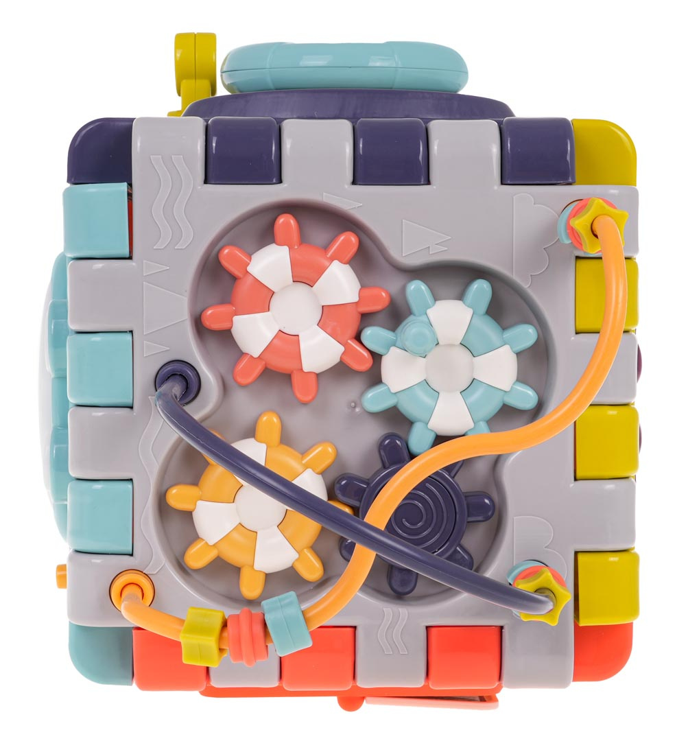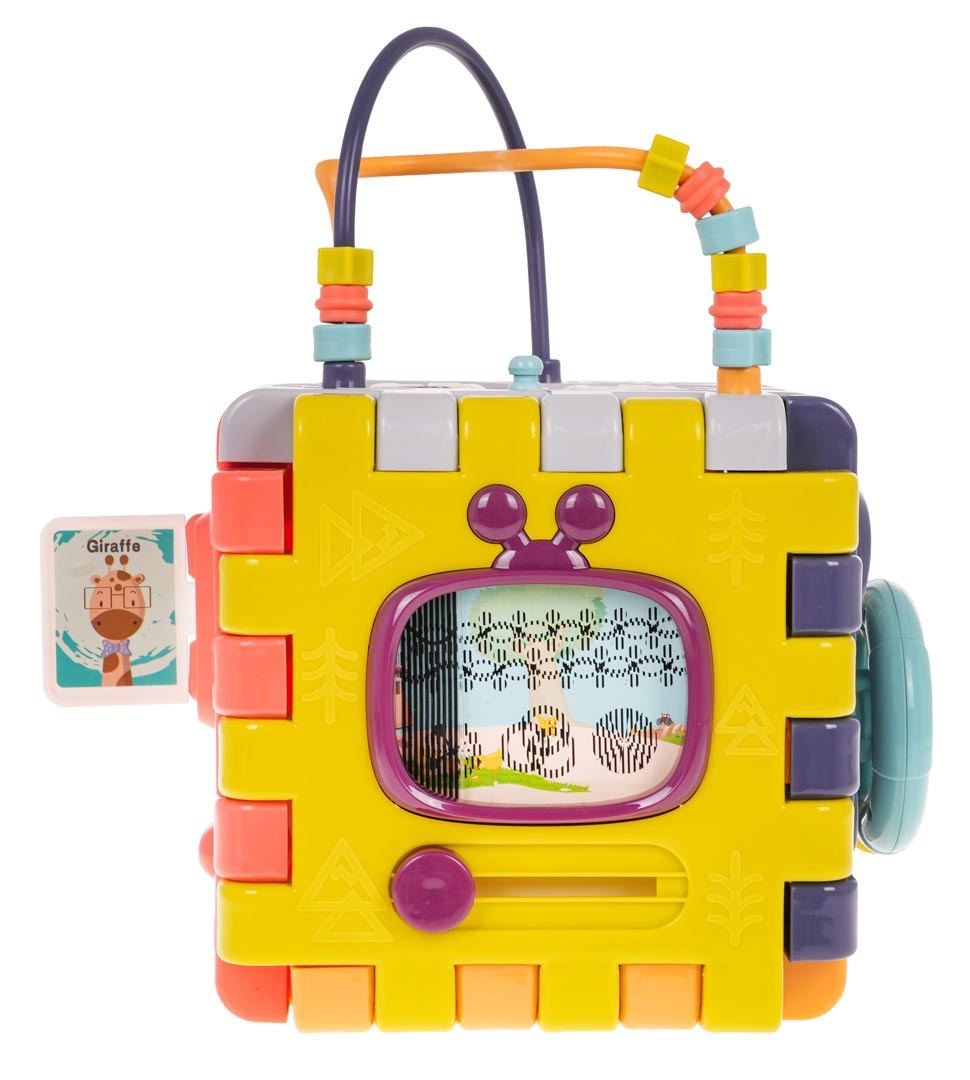 Multifunkčná interaktívna kocka so zvukovými a svetelnými efektmi pre deti od 18 mesiacov. Každá stena boxu poskytne dieťaťu množstvo zábavy a interaktívnej hry. Zvukové a svetelné efekty a bohatstvo farieb upútajú pozornosť dieťaťa a povzbudia ho k hre. Kocku môžeme rozkladať a hrať sa s jednotlivými prvkami naplocho. Hračka je napájaná batériami typu 3 x AAA 1,5 V (nie sú súčasťou balenia).