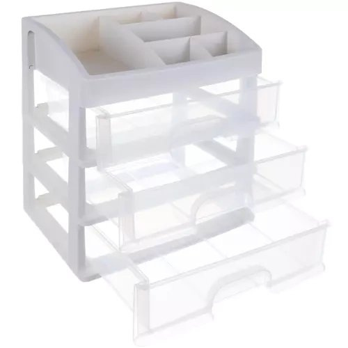 Mimoriadne praktický organizér s tromi priehľadnými zásuvkami na kozmetiku, šperky a iné drobnosti. Horný regál s až 6 priehradkami a 3 spodnými zásuvkami pojme množstvo kozmetiky alebo kancelárskych potrieb, ktoré sa používajú každý deň. Organizér je ideálny na uloženie rúžov, púdrov, rúžov, bronzerov a všetkých ostatných drobností, ktoré vám zostali v kabelke alebo na stole. Vďaka svojmu univerzálnemu dizajnu sa organizér hodí do interiéru každej miestnosti bez toho, aby narúšal jej zariadenie. Urobte si poriadok vo svojom dome ešte dnes!
