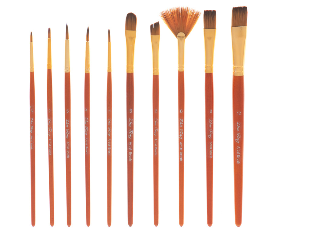 Sada 10 umeleckých štetcov určených pre rôzne typy farieb.