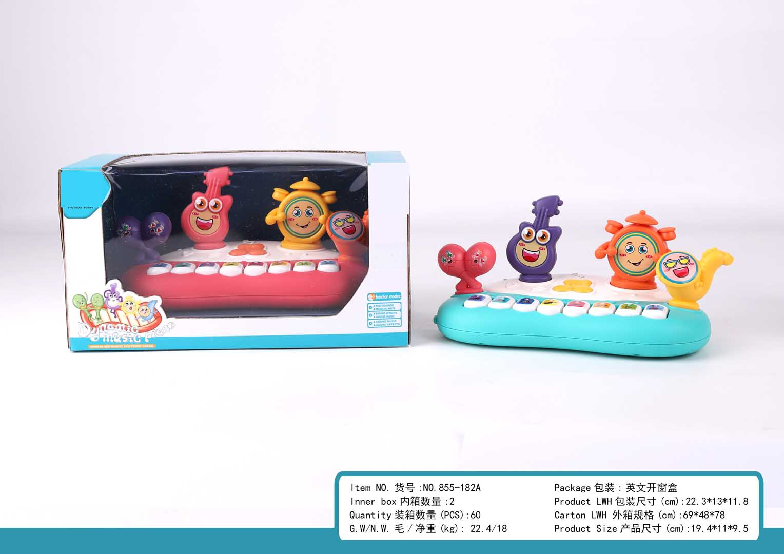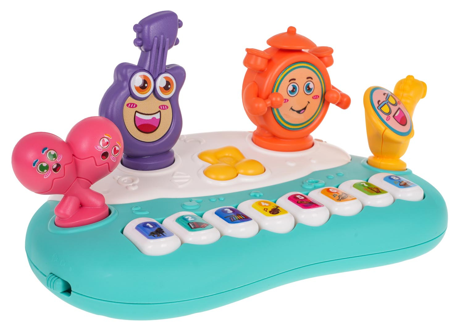mesiace veku. Hračka bola vyrobená z najkvalitnejšieho plastu v živých farbách, ktoré priťahujú pozornosť dieťaťa. Je bezpečná pre malé deti, nemá ostré hrany. Veselé pianko je napájané batériami typu 3 x AAA 1,5 V (nie sú súčasťou balenia). Disponuje reguláciou hlasitosti a zvukovými a svetelnými efektmi. Po stlačení tlačidla s notou budeme počuť hudbu a tlačidlo sa rozsvieti. Každá z ôsmich kláves pianka generuje iné zvuky nástrojov a blikanie tlačidla s notou.