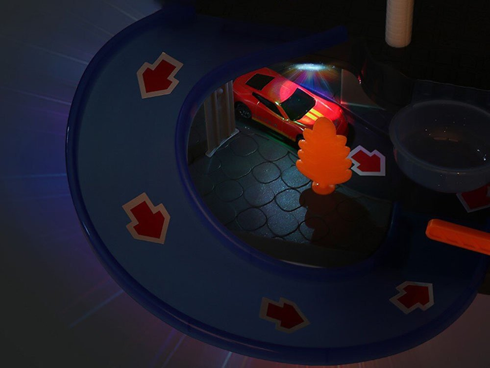 Celá súprava je vyrobená z plastu, na prízemí je výťah, ktorým sa dá auto vyviezť hore a po umytí bezpečne zložiť.Ak chcete auto umyť, umiestnite do hornej časti hračky trochu vody a potom pomocou modrej labky vylejte vodu, ktorá dopadne na auto. Po umytí prachu z vozidla sa vozidlo odvezie dole, kde sa vysuší uterákom. Je doplnená o samolepky, svetelné a zvukové efekty, ktoré zvyšujú zábavu.