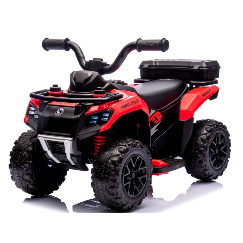 Vybavenie vozidla: lítiová batéria 7,4V4,3ah, motor 25 Watt, vypínač/zapínač napájania, prepínač smeru jazdy vpred-vzad, nabíjačka 8,4V1A (vstup 220-230 V), svietiace predné svetlá, hudobný panel s melódiami, zvuk štartujúceho motora pri zapnutí quadu, 4 kolesá (dve vpredu, dve vzadu), 2 rýchlosti (vpred a vzad), plynový pedál, farebné nálepky na quade (polepené), Kufrík vzadu na drobnosti,