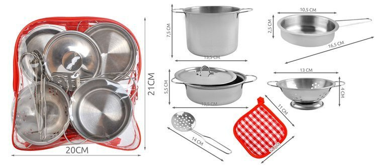 13 položiek - sada obsahuje 13 prvkov, t. j.všetko potrebné pre malého kuchára: 2 hrnce, panvica, cedidlo, pokrievka (pasuje na každý hrniec), sada rôznych lyžičiek, ruksaka materiálová podložka s rukavicou.