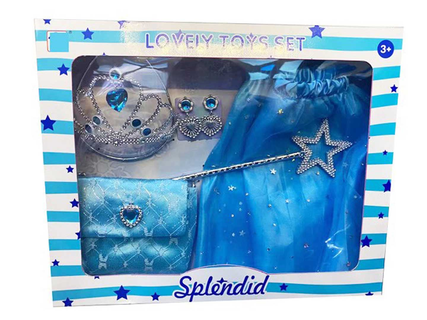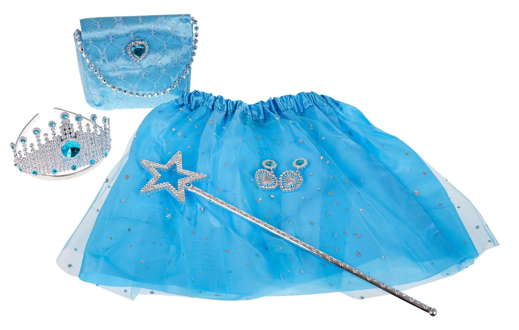 Skvelá sada, oblečenie pre malú princeznú od 3 rokov. Súčasťou sady je tiara, čarovná palička, náušnice, kabelka a suknička. Súprava bola vyrobená s dôrazom na detaily v krásnej modrej farbe.