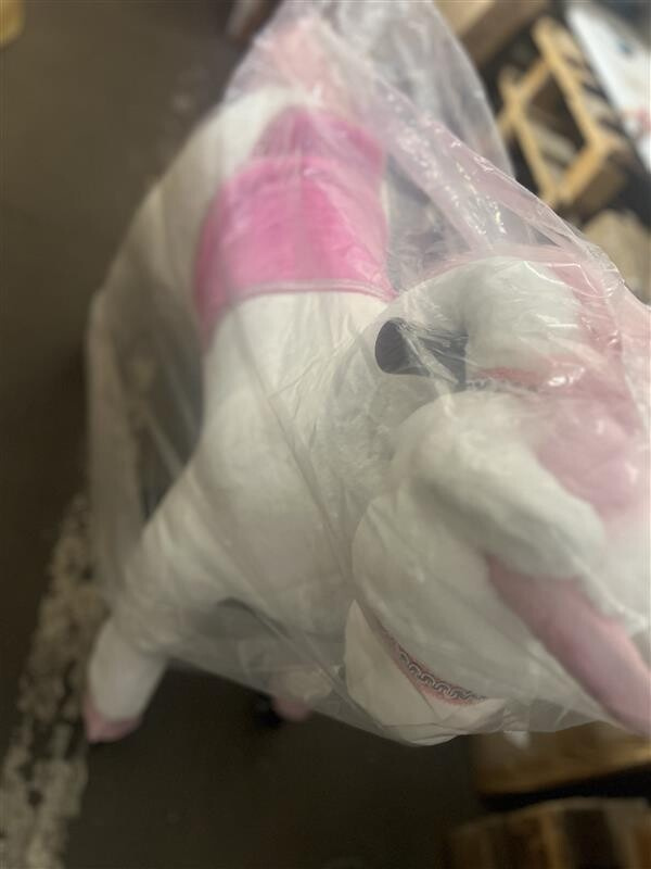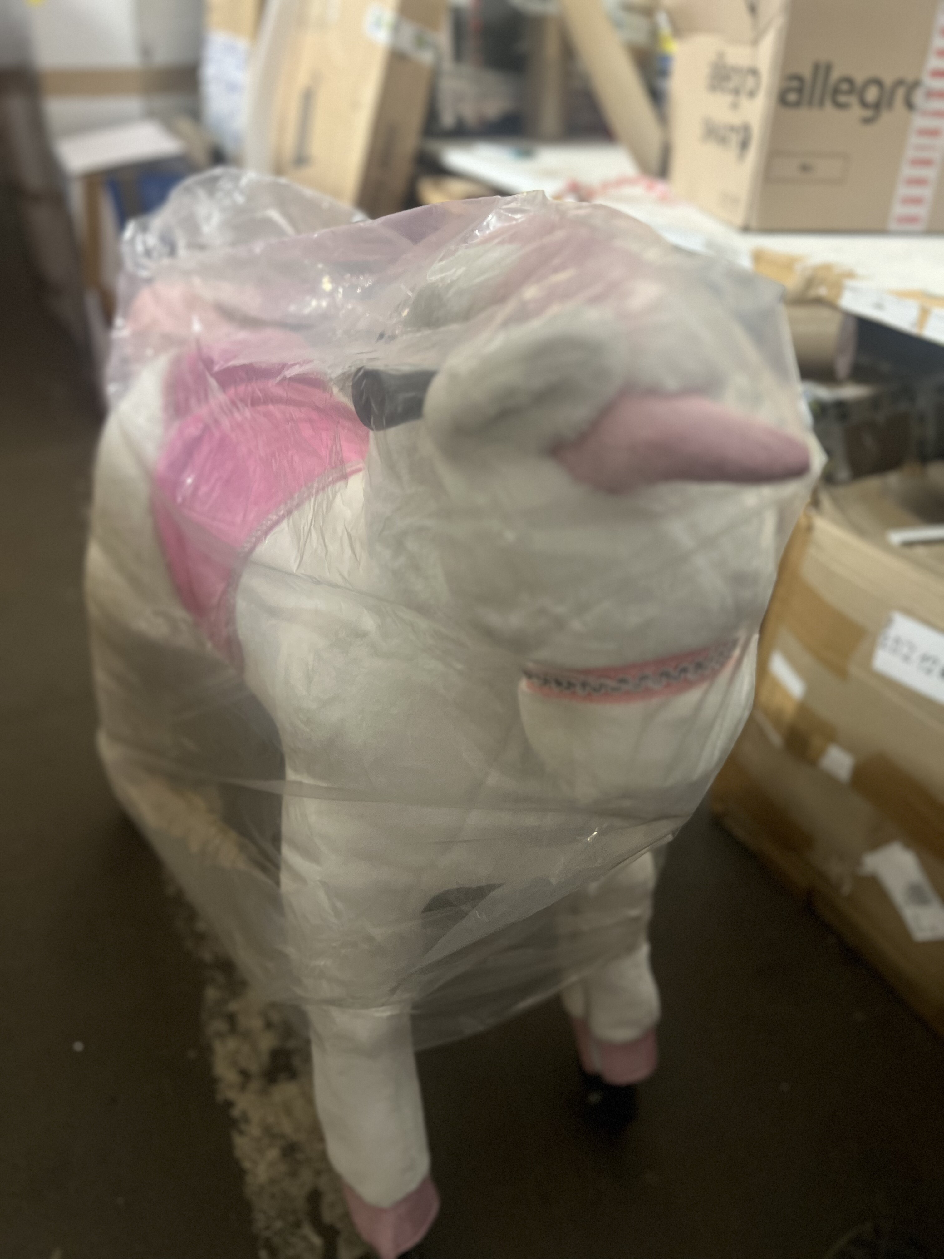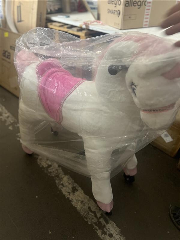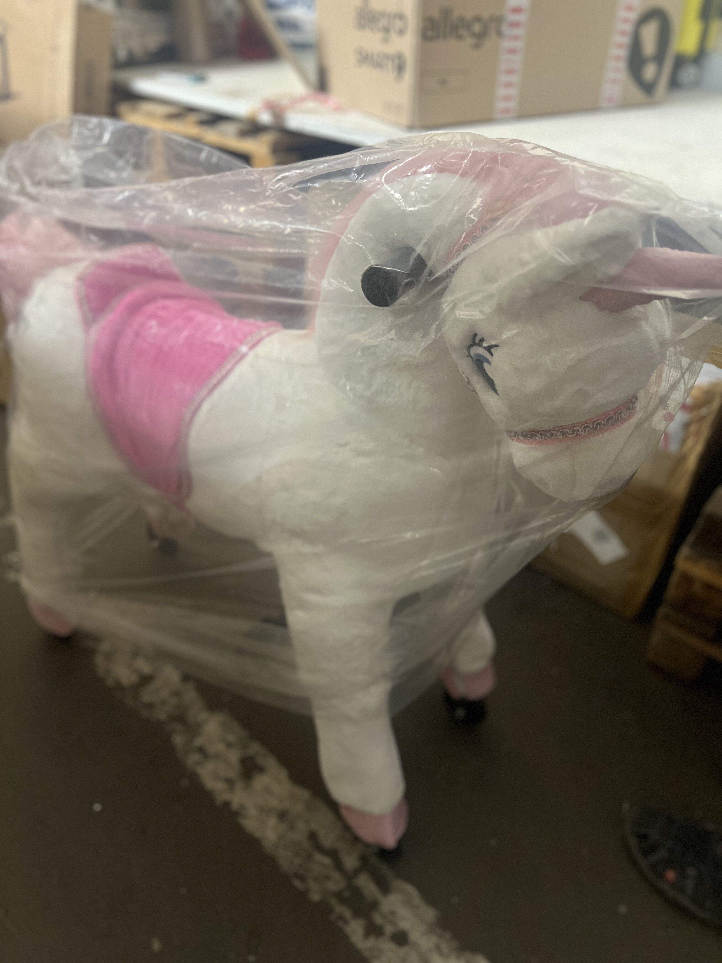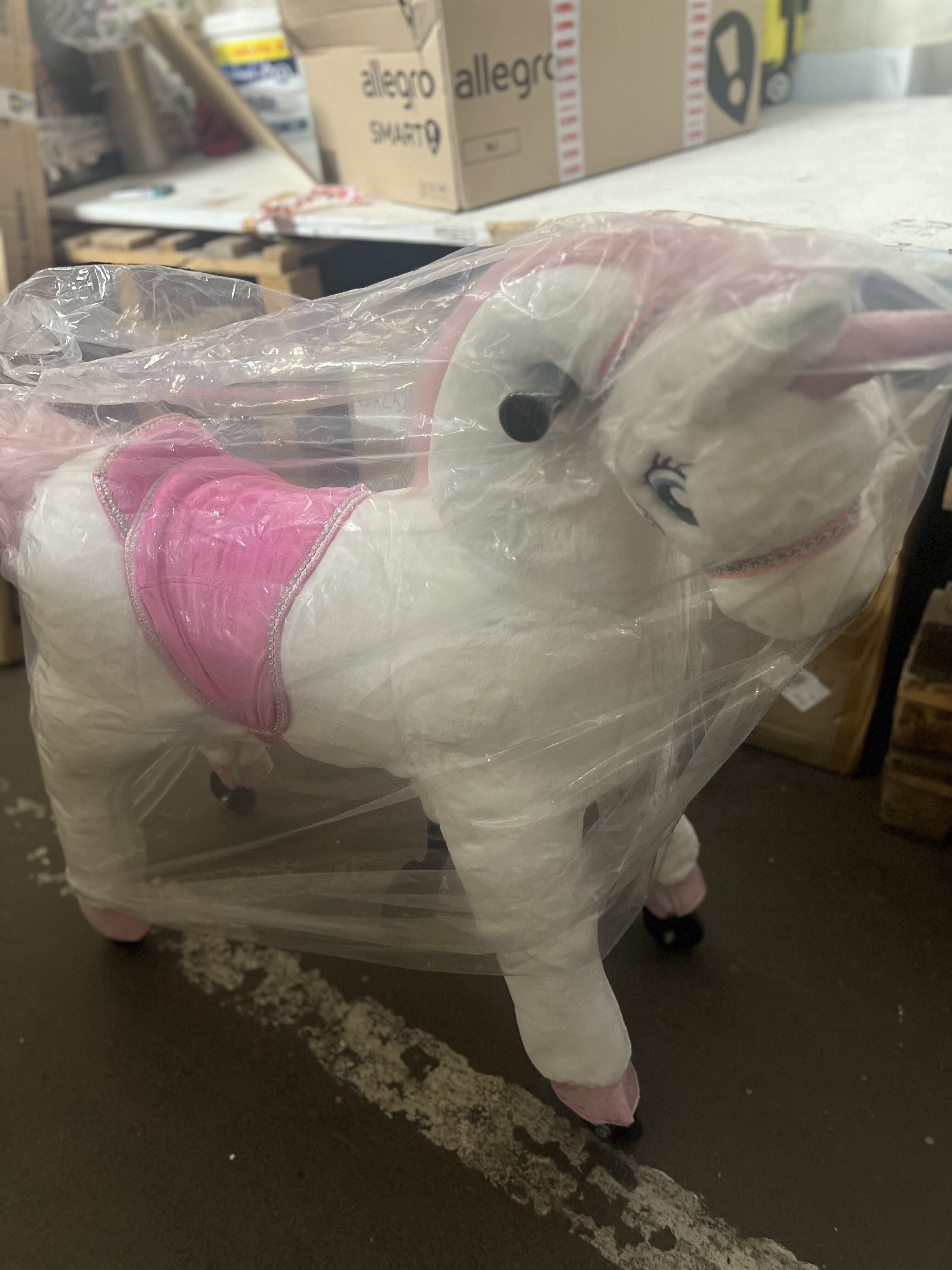 Hrdý jazdecký kôň jednorožec Unicorn na kolieskach. Kôň sa rozbehne pri správnom pohybe jazdca. Koníčka možno smerovať doprava aj doľava. Kôň je na povrchu potiahnutý mäkkým plyšom a je tak veľmi príjemný na dotyk. Vybavené zipsami a snímateľným vonkajším poťahom. Koník je vybavený madlami a pedálmi na nohy. Robustná kovová konštrukcia zaisťuje stabilitu a bezpečnosť pri používaní. Nosnosť min. 25 kg do max. 65 kg.Hlavné vlastnosti: výška sedla 68 cm hojdavé pohyby pri jazde trénujú rovnováhu, koordináciu a obratnosť
