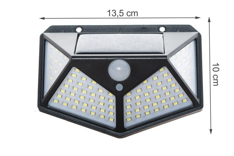 ŠPECIFIKÁCIA - Čierna farba; materiál: ABS + PC; počet LED: 100; solárny panel: monokryštalický; batéria: lítiová 3,7V; výstupný výkon: 7W; doba nabíjania: 6 hodín na slnku; Uhol detekcie PIR: 120 stupňov; uhol svetla: 270 stupňov; detekčná vzdialenosť: 8-10m; vodotesné: IP65; rozmery (šírka / výška): 13,5 / 10 cm, hmotnosť: 0,15 kg; hmotnosť v balení: 0,20 kg.