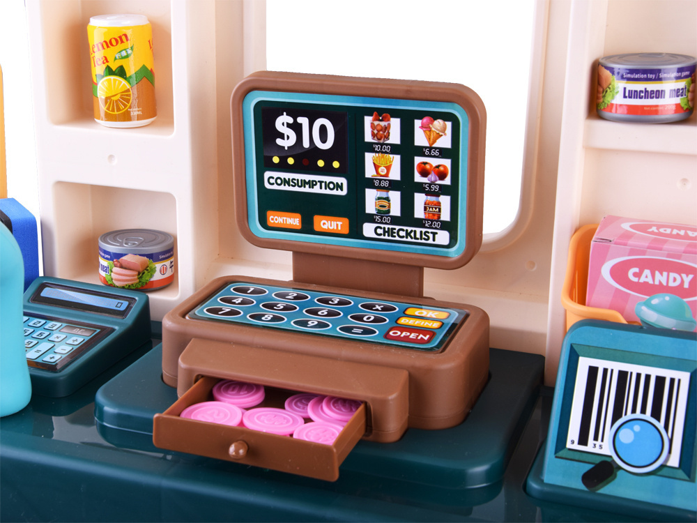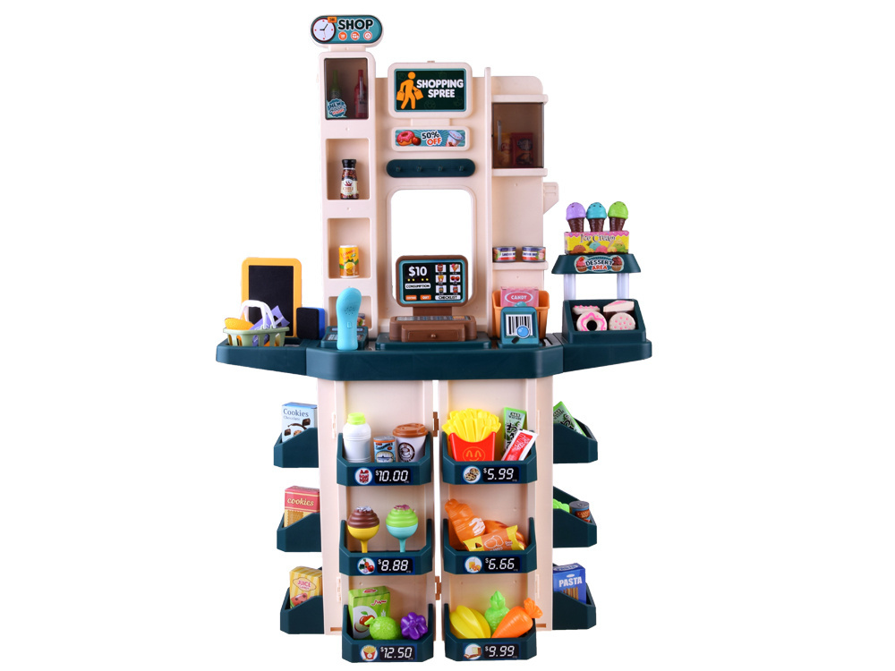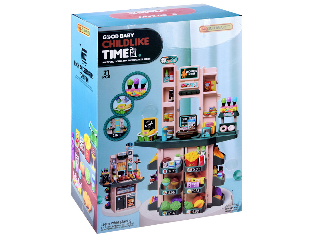 Deti rady napodobňujú dospelých, keď sa hrajú na lekára, dom alebo len na obchod. Táto veľká, dobre vybavená súprava obsahuje všetko, čo potrebujete na prevádzku vlastného trhu. Pri hre na obchod si dieťa precvičuje počítanie, učí sa sociálnym zručnostiam a je to tiež dobrá príležitosť na rozhovor o zdravej výžive. Hračka je celá vyrobená z plastu v príjemných tlmených farbách. To je doplnené farebnými nálepkami a bannermi, vďaka ktorým obchod vyzerá realistickejšie.