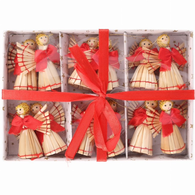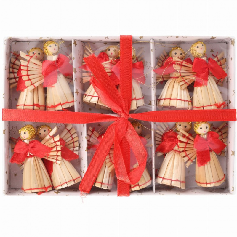 STRAW BOMBIES ANGELS COMPONENT - 12 kusov. Výška: 5,5 cm Šírka: 4,5 cm Sada krásnych, originálnych ozdôb zo slamy. Dokonalá vianočná dekorácia na stromček aj do rákosia. Vysoká kvalita dodáva tejto dekorácii jedinečný vzhľad. Sú krásne a rozhodne originálne!