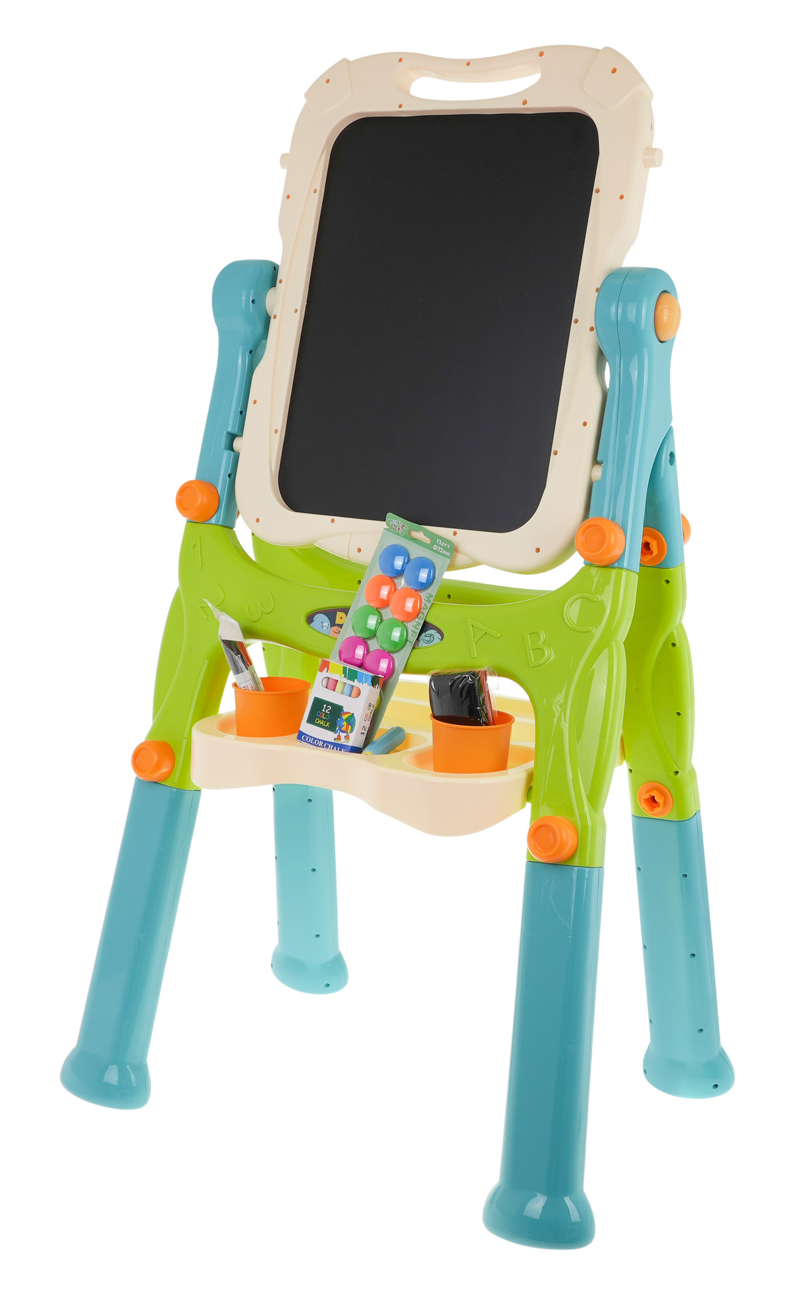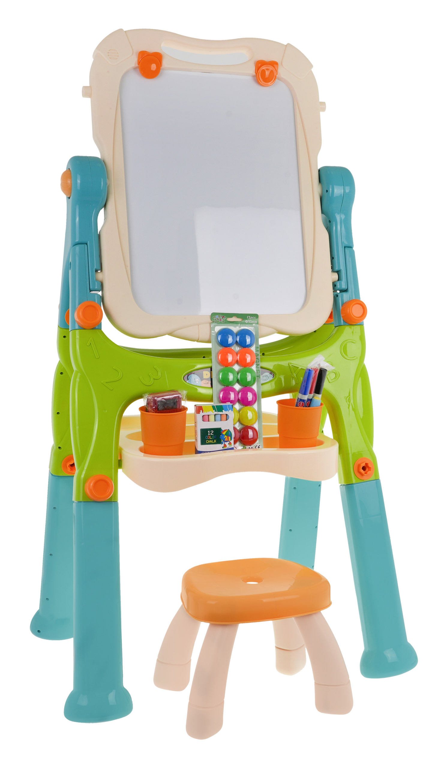 Obojstranná dvojpolohová tabuľa na stojane s príslušenstvom na maľovanie pre deti od 3 rokov. Tabuľa je z jednej strany biela magnetická a z druhej strany kriedová. Na bielu stranu môžete písať perami, ktoré sú súčasťou sady, a potom maľby zotrieť hubkou. Biela strana slúži tiež na pripevnenie farebných magnetov, ktoré sú súčasťou sady. Na bielej strane sú tiež špeciálne klipy na pripevnenie listov papiera, na ktoré sa maľuje. Na čiernu, kriedovú stranu môžete maľovať kriedou. Súčasťou balenia je špeciálny držiak na kriedy, ktorý zabraňuje ich lámaniu a udržuje ruky našich najmenších čisté. Na čiernu stranu je možné tiež pripevniť magnety. Dosku možno otáčať o 360 stupňov a je starostlivo vyrobená. Všetky hrany sú zaoblené, aby bolo zabezpečené bezpečné používanie. Stavebnica sa ľahko zostavuje a rozoberá. Pokyny pre skladanie na obale. Sada má rukoväť pre ľahké prenášanie z miesta na miesto a osem nôh, štyri nižšie a štyri vyššie.