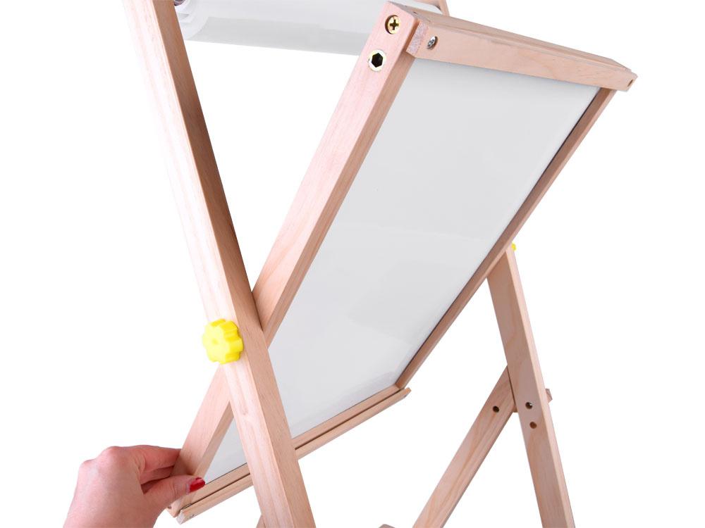 Obojstranná drevená doska s dvoma rôznymi povrchmi na maľovanie, kreslenie splní požiadavky každého dieťaťa. Tabuľa je vybavená poličkou na nevyhnutné doplnky, počítadlom, rolkou papiera a magnetickými písmenami a poskytne každému dieťaťu množstvo kreatívnej a umeleckej zábavy.
