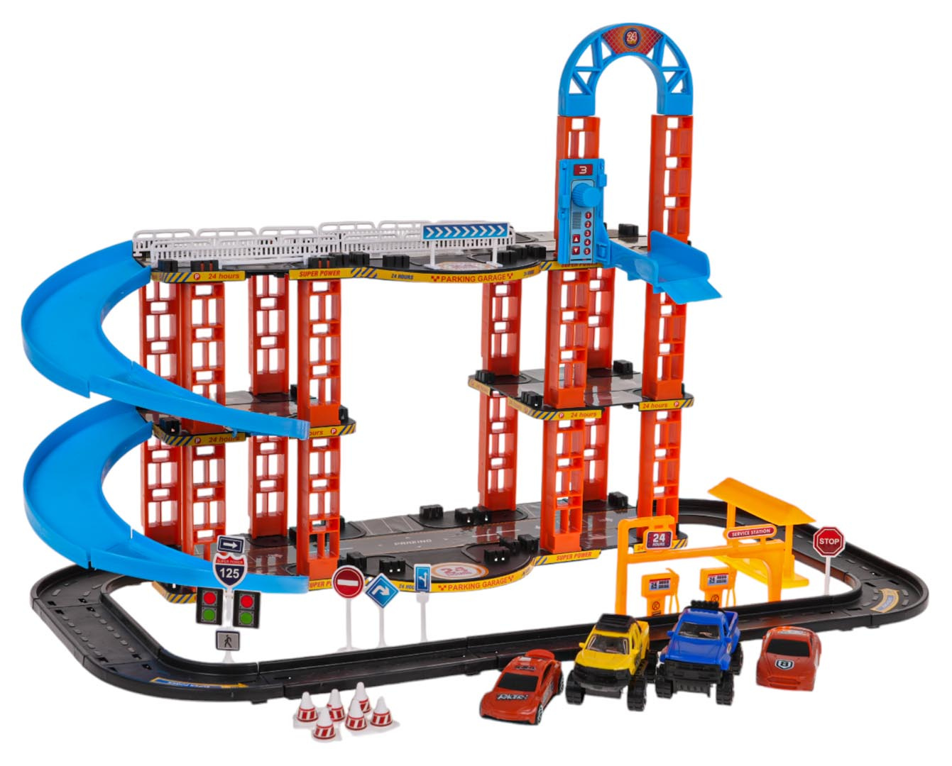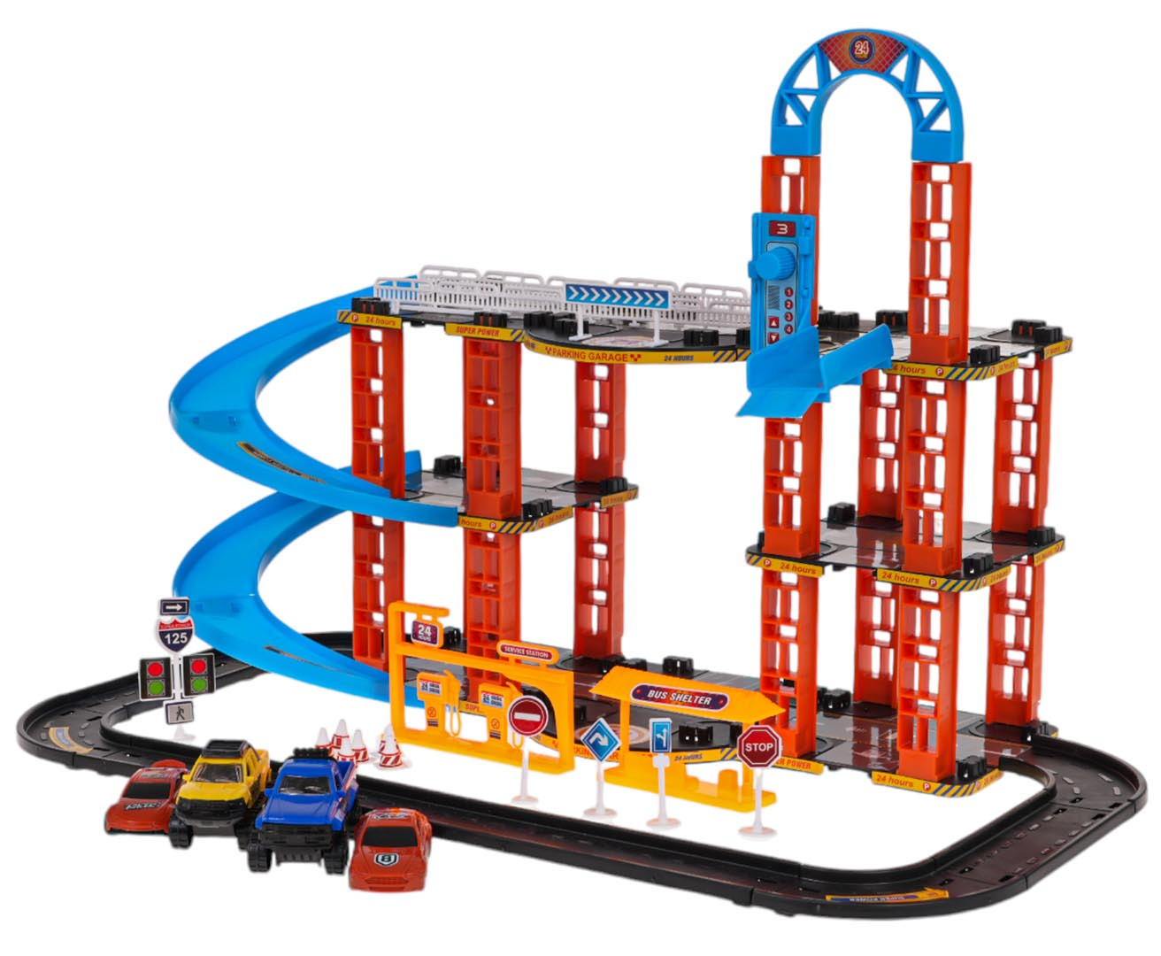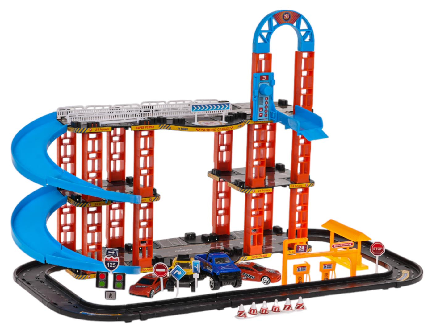 Sada sa skladá z prvkov pre vlastnú montáž. Bol vyrobený z najkvalitnejšieho plastu v živých farbách. Na spodnom parkovisku sa nachádza dráha pre autíčka, v sade máme 4 rôzne autíčka. Nad traťou bol umiestnený dvojúrovňový parkovací dom s výťahom. Z hornej úrovne môžu autíčka schádzať šmykľavkou.