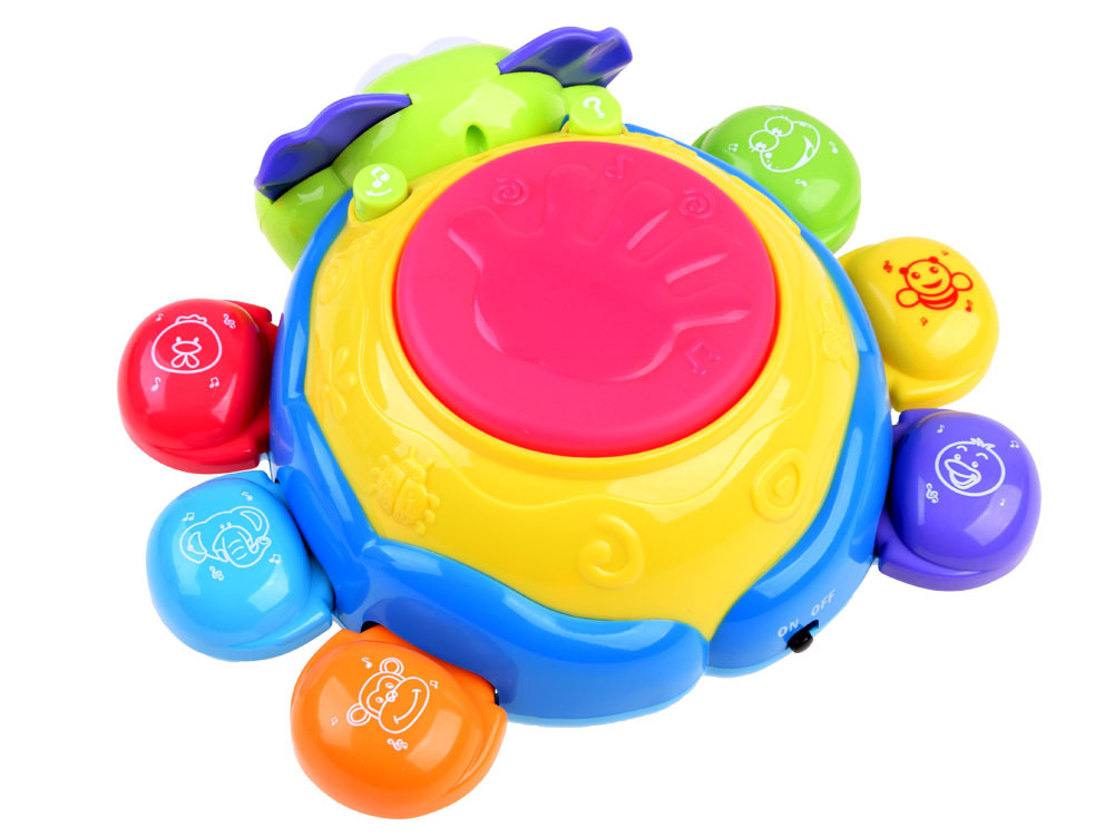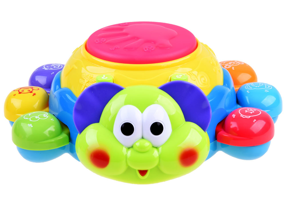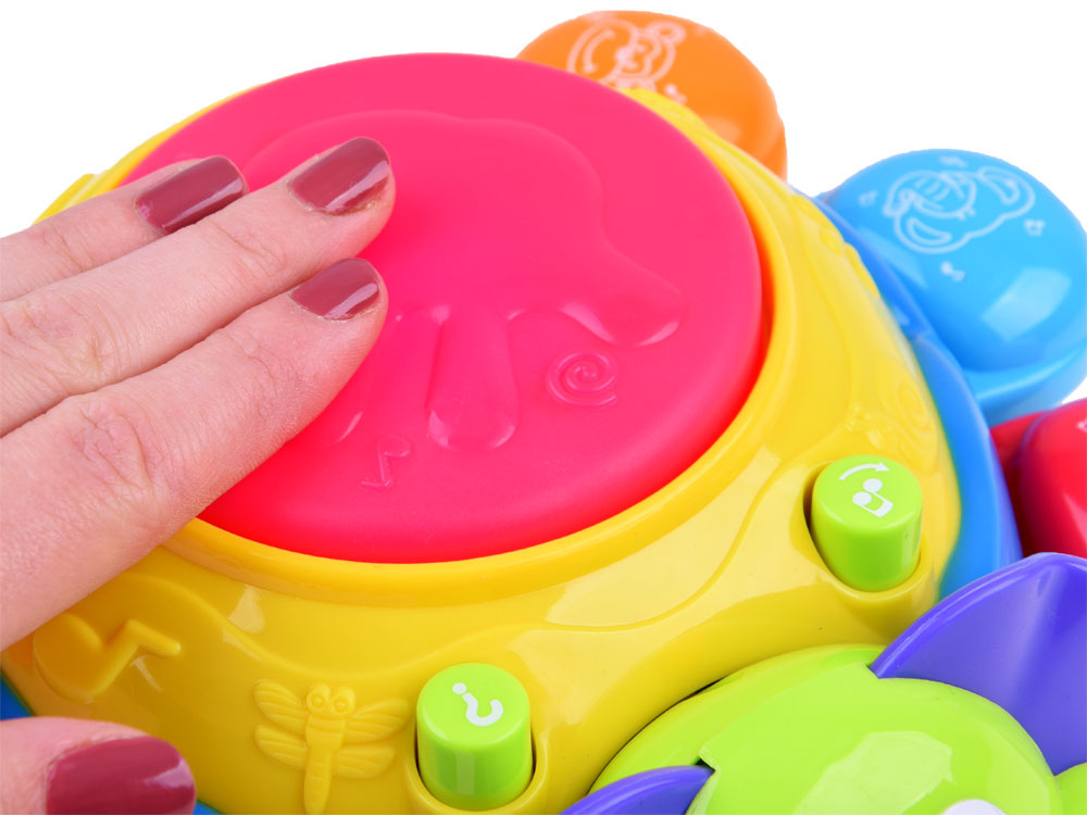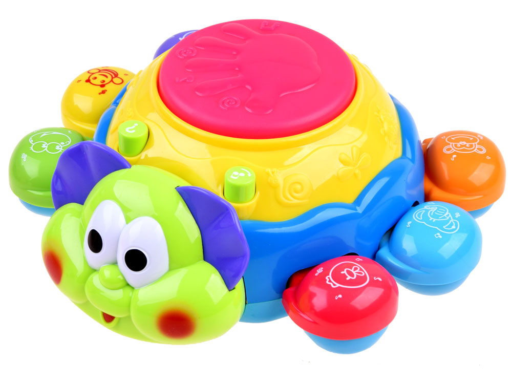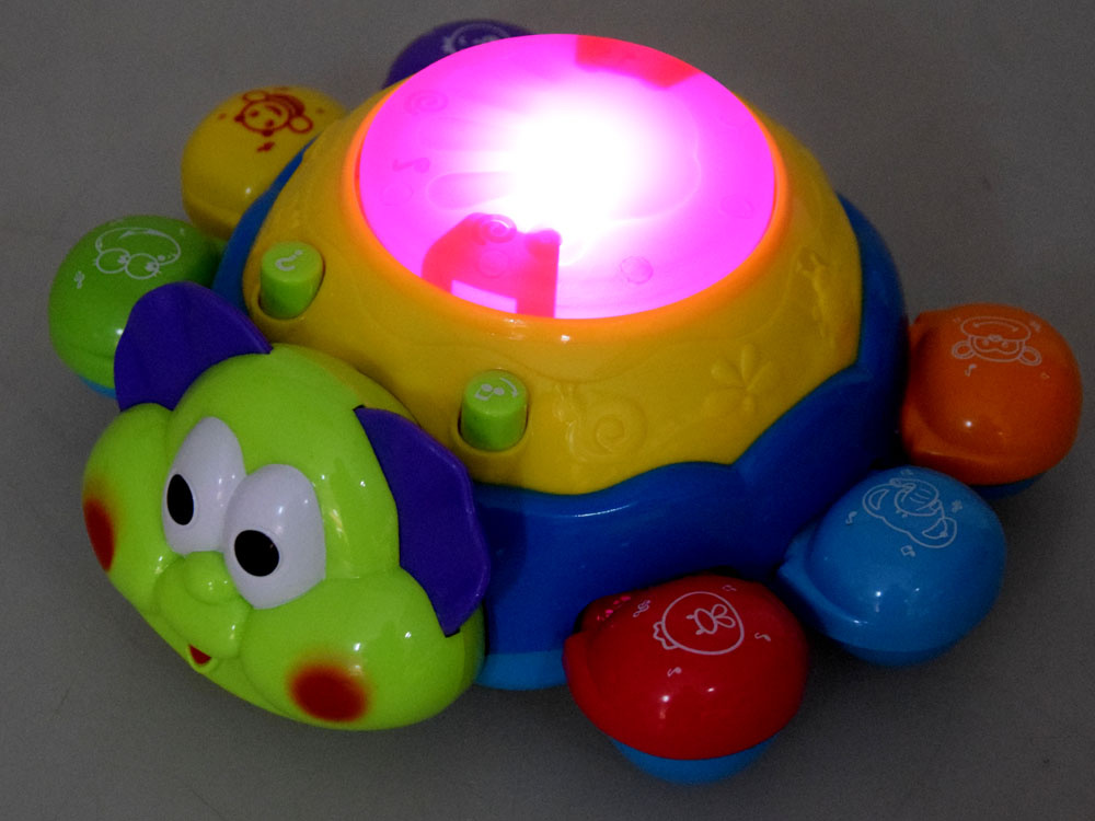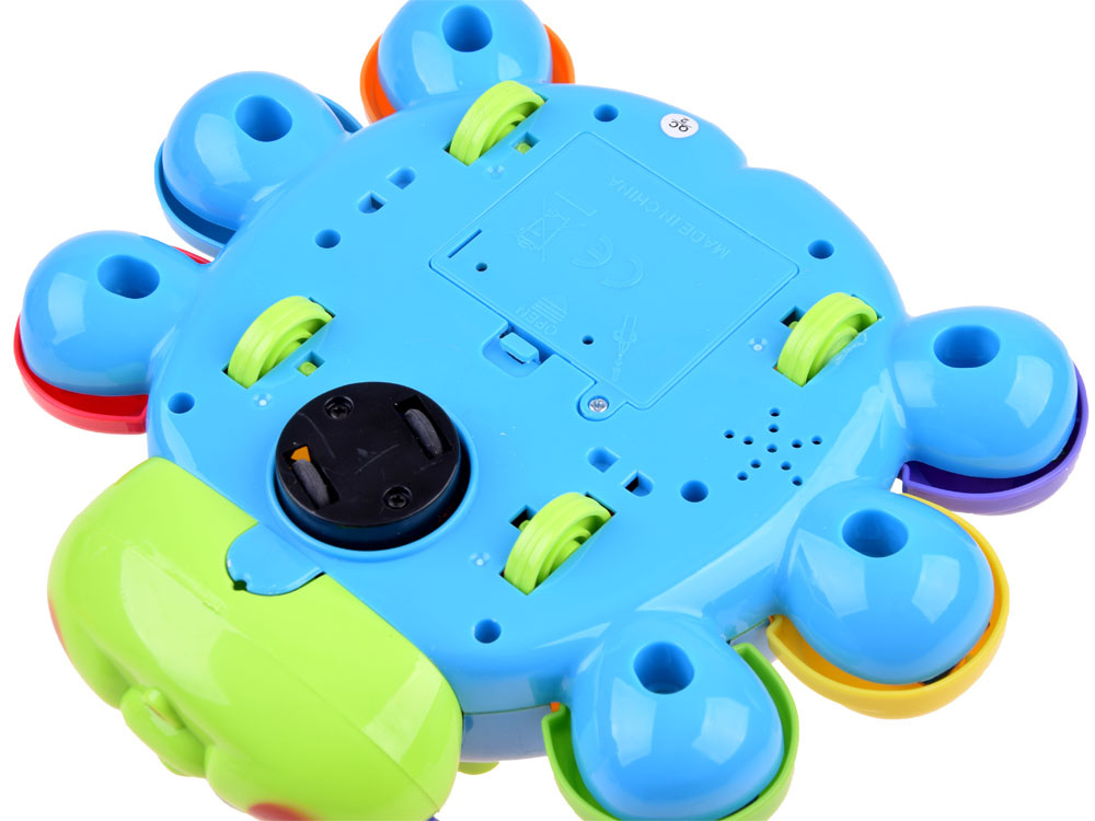 - na zadnej strane je tlačidlo s notami, ktoré vydáva veselé melódie a blikajúce svetlo. Veľké červené svietiace tlačidlo na zadnej strane slimáka mení zvukové efekty