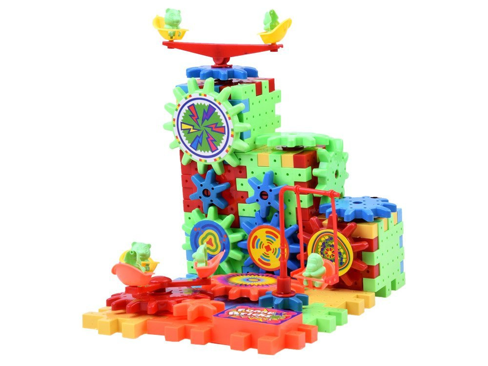 rôzne budovy a stavby. Spojením ozubených kolies môžeme vytvoriť rotujúce štruktúry, ktoré ponúkajú neobmedzené možnosti na vytváranie vlastných vynálezov a nápadov. Vzorové zostavy sú uvedené na obale.