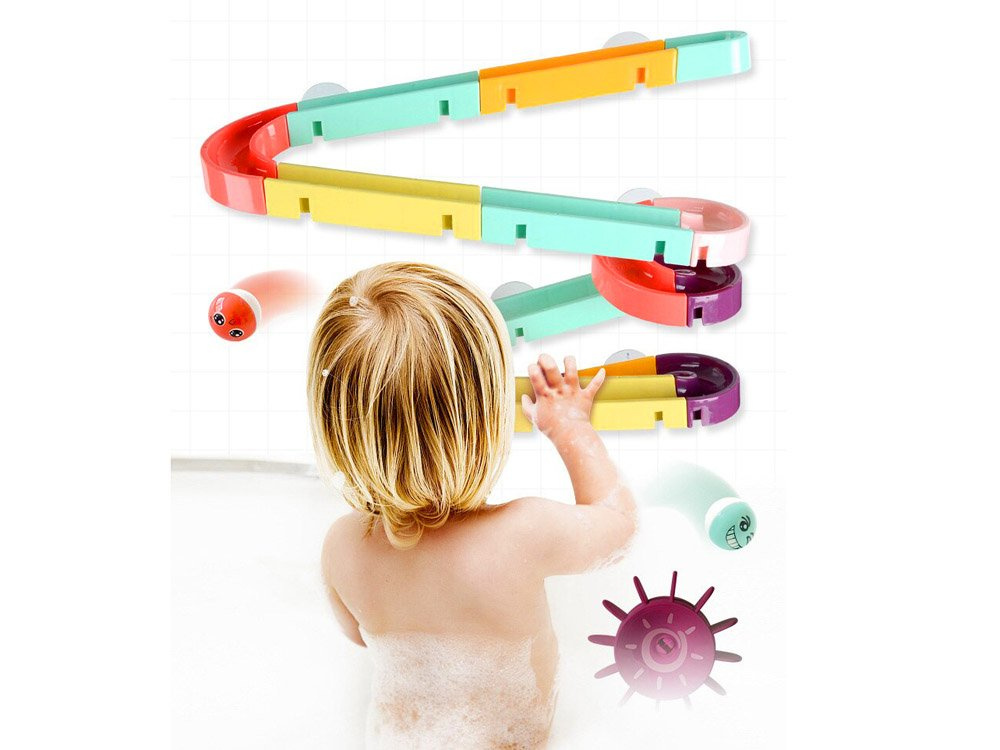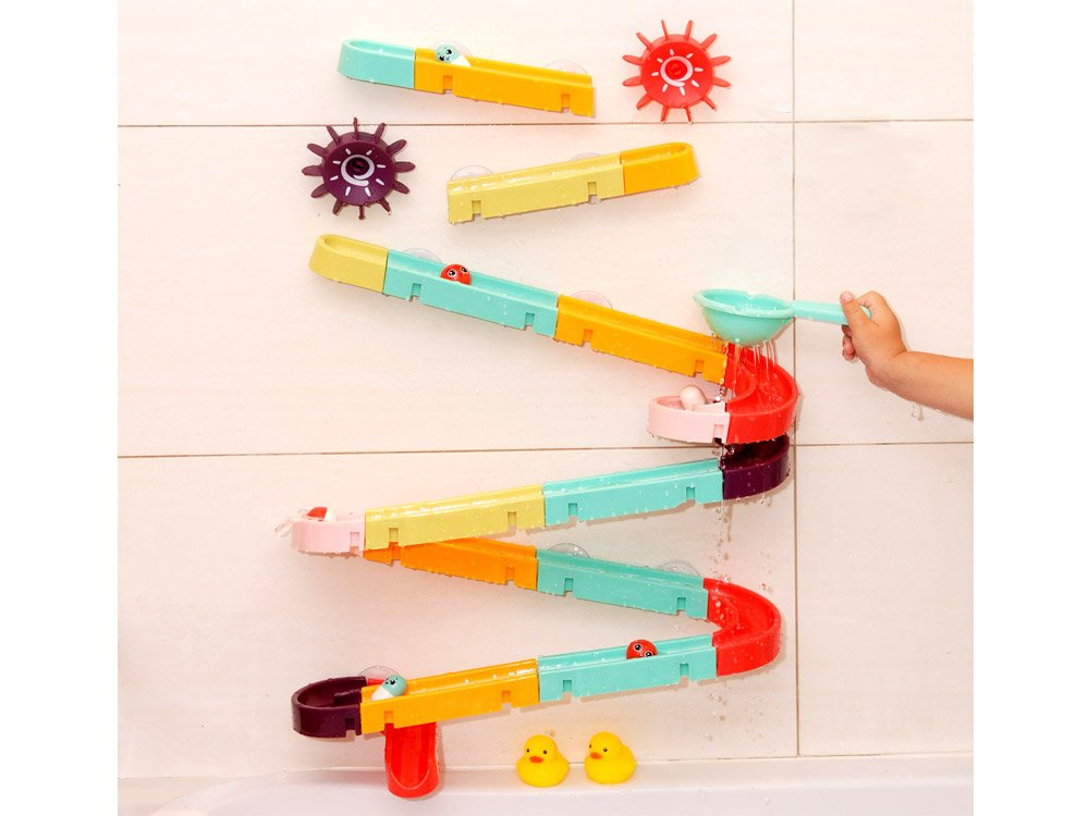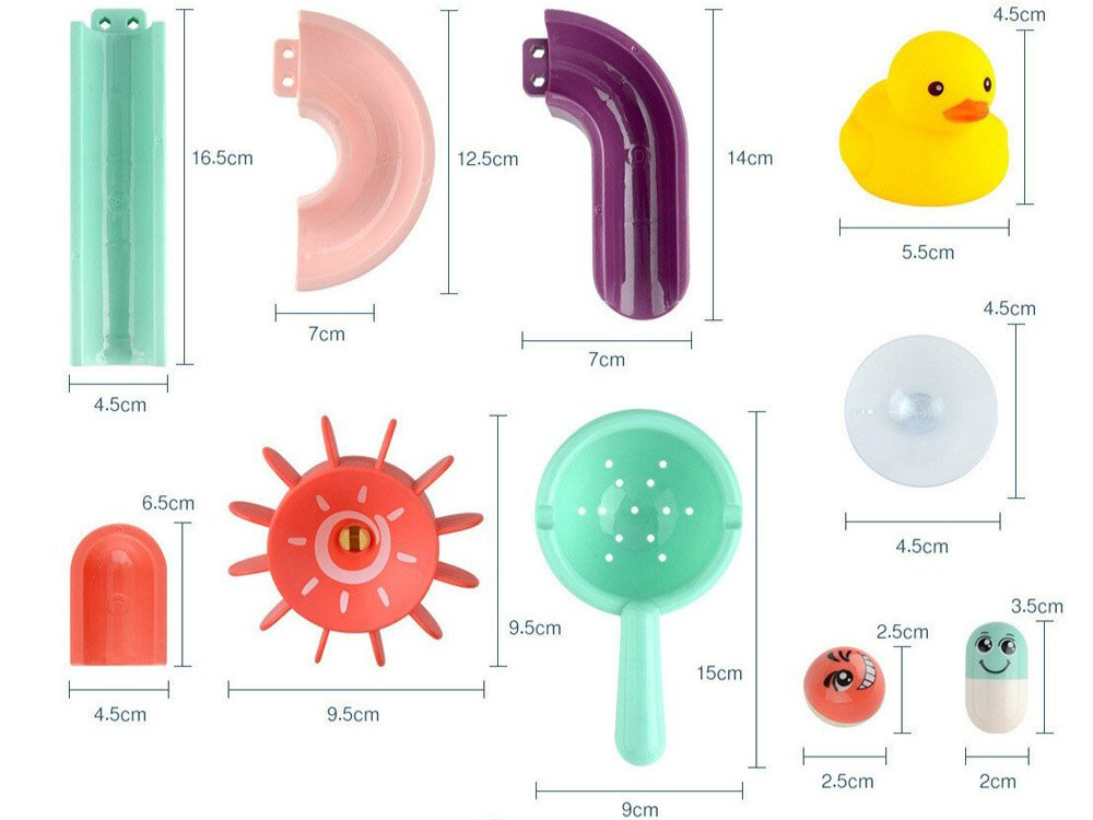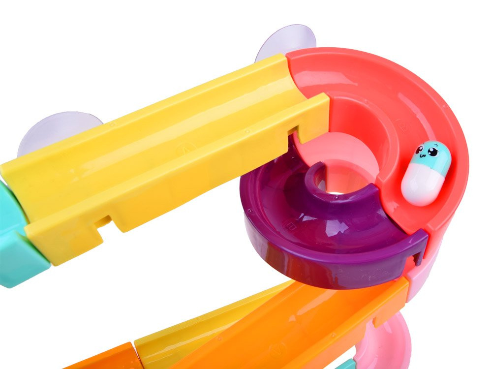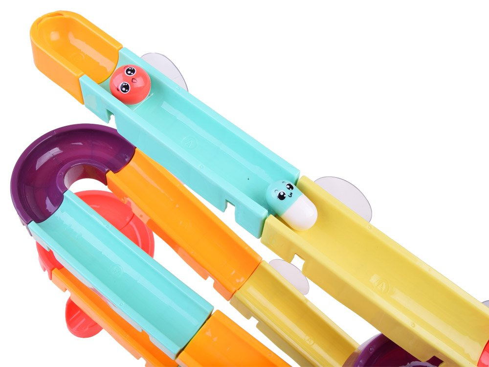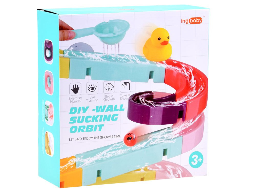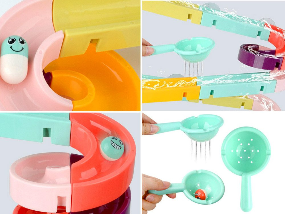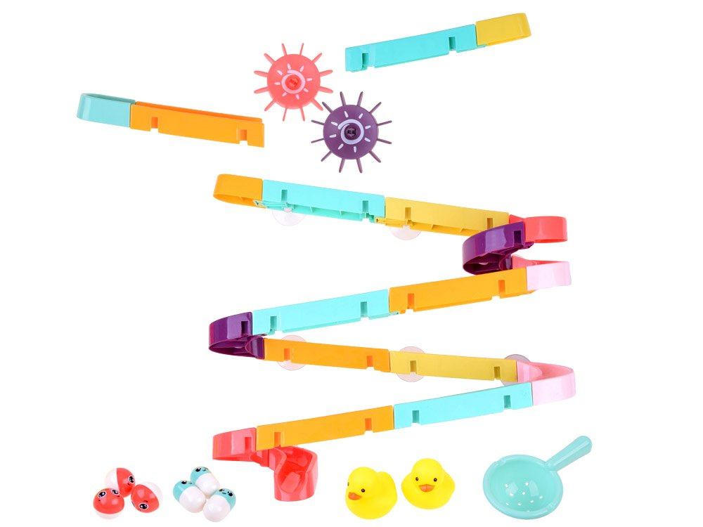 Súprava je vyrobená z plastu a má silikónové prísavky, takže dráhu možno pripevniť na obkladačky v kúpeľni. Súčasťou balenia sú farebné dieliky na zostavenie špirálovej dráhy, gumové kačičky, loptičky, fazuľky a sitko. Pri kúpaní môže dieťa vymýšľať fantastické hry s utekajúcou kačičkou, naháňačkou a valčekmi, ktoré sa dajú prilepiť vedľa seba, takže dieťa môže točiť oboma naraz. Súprava sa skladá zo 44 dielov, z ktorých si môžete postaviť šmykľavku.