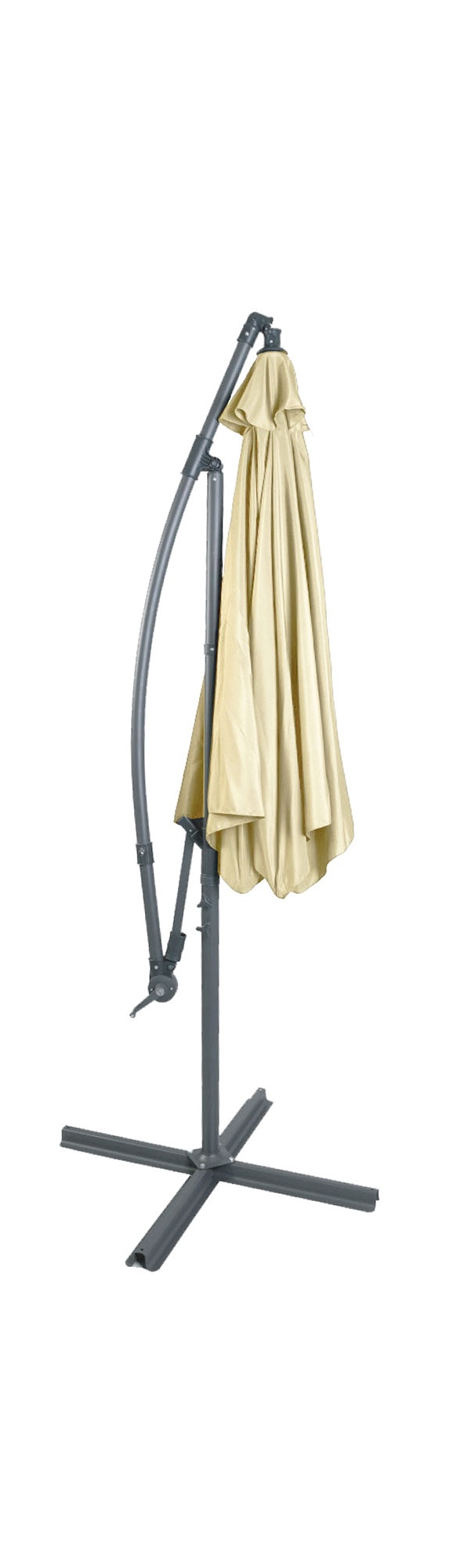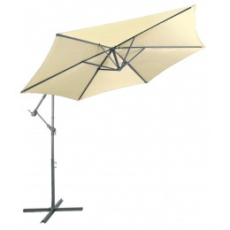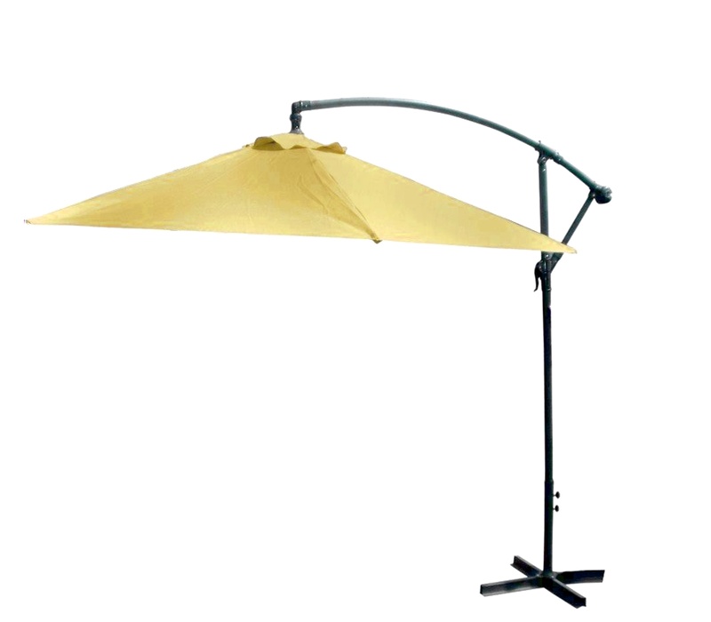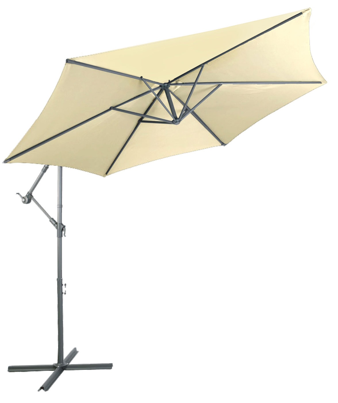Praktický záhradný slnečník z odolného polyesteru, ktorého noha je umiestnená mimo zatienenej plochy.