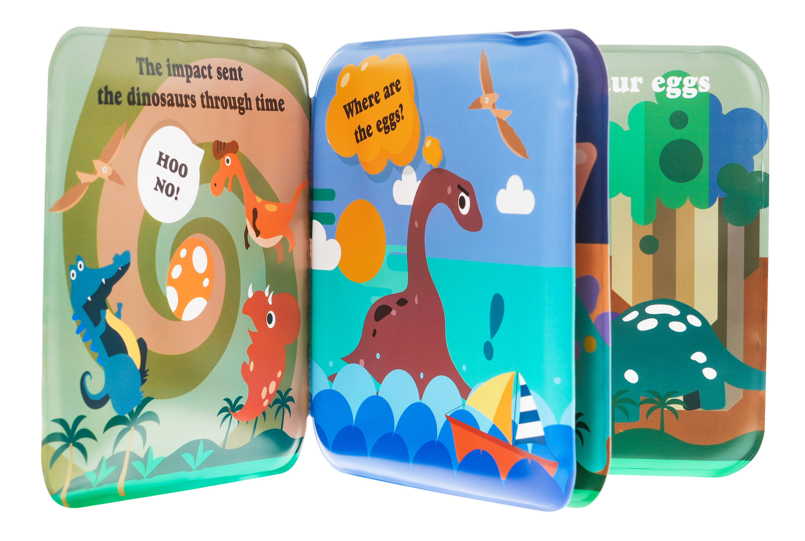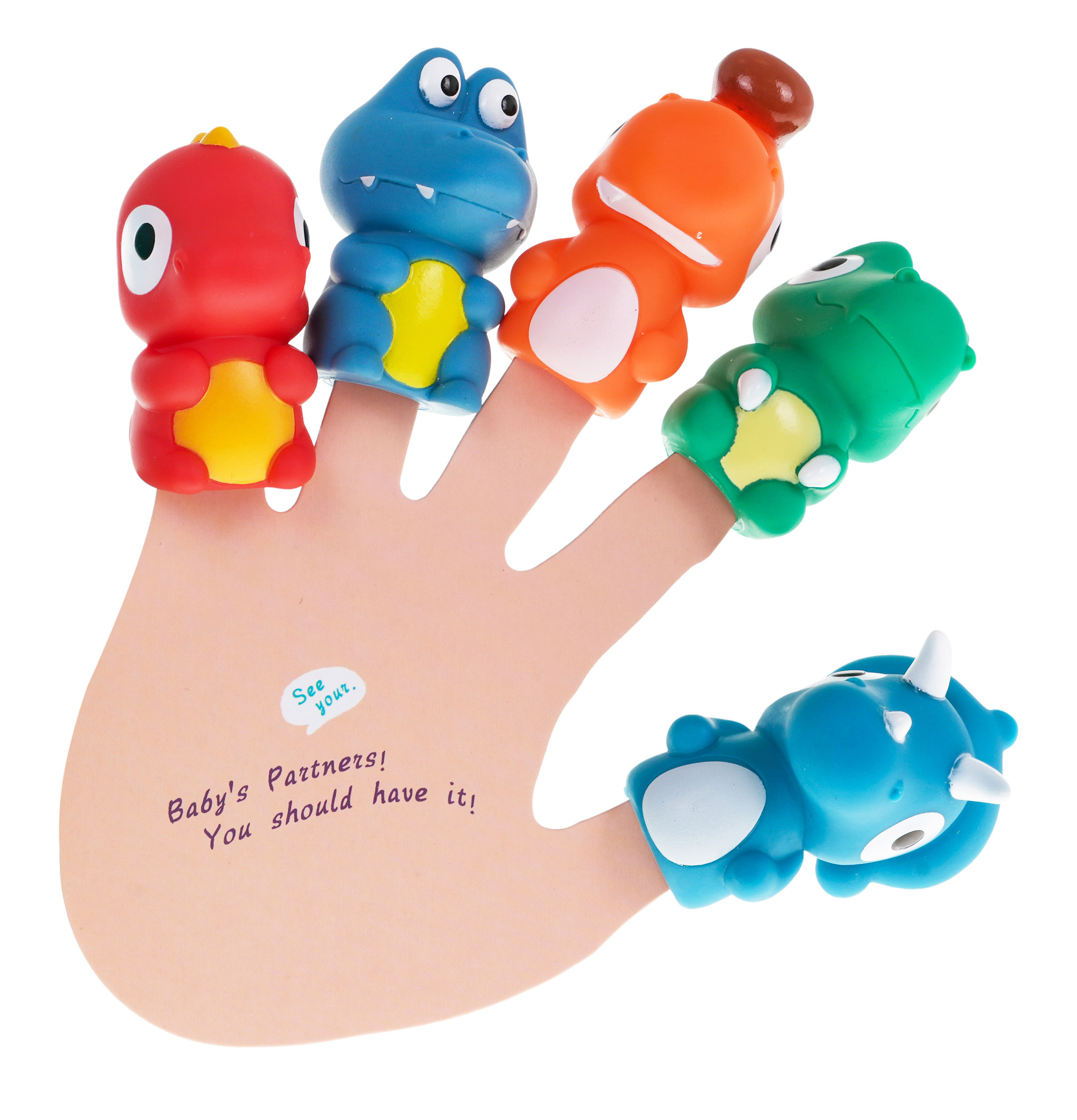 Sada gumových prstových maňáskov - dinosaurov s mäkkou brožúrkou o dinosauroch je vhodná pre deti od 3 rokov. Prstové bábky sú skvelou zábavou a účinným vzdelávacím nástrojom pre deti. S touto sadou budú môcť deti aj dospelí hrať divadelné hry s dinosaunami ako hlavnými postavami. Súčasťou sady je mäkká brožúra s dobrodružstvami dinosaurov. Titulky v brožúrke sú v angličtine. Na prednej strane brožúry v pravom dolnom rohu je píšťalka. Kniha a bábky sú vodoodolné a nemajú ostré hrany. Hra s bábkami pozitívne ovplyvňuje rozvoj predstavivosti, motoriky a sústredenia.
